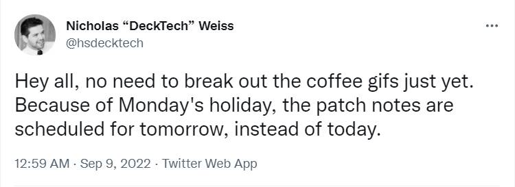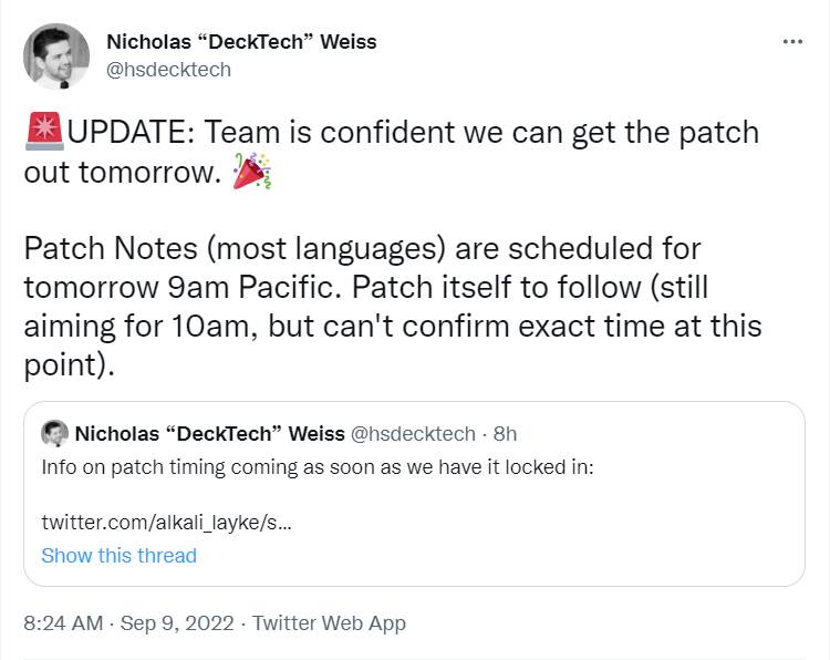 【——凌晨第二时间,DeckTech和社区经理Alkali表示补丁的上线“可能”也是明天,还要等后续确认】