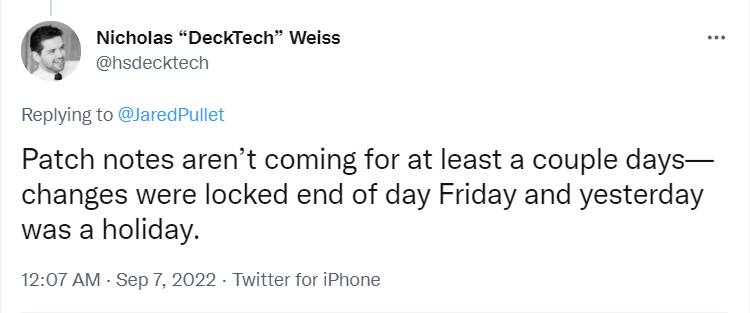 (另另外,也从来没人说过上周五就会公布补丁——至少我在营地写的都是“周六敲定”“美西周五敲定”,只是开发团队内部敲定,不知道是从哪传开的。虽然Alec Dawson任平衡组首席时是会在敲定后以个人身份发推特预告内容的,但那只是他个人的行为,不见得后继者也都要这么做)