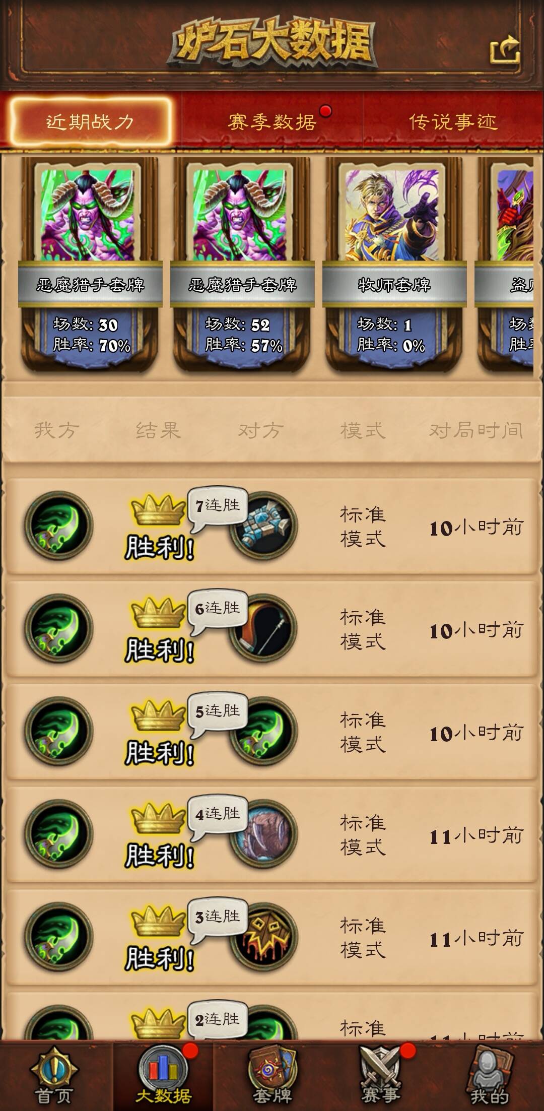 事实上我首先是用战绩截图中的第二套57%胜率的快攻瞎上分,但玩下来体验并不佳。之后在钻二时改用第一套70%胜率的圣物瞎,并一晚上打到了传说5000分段。直到现在已有七连胜。