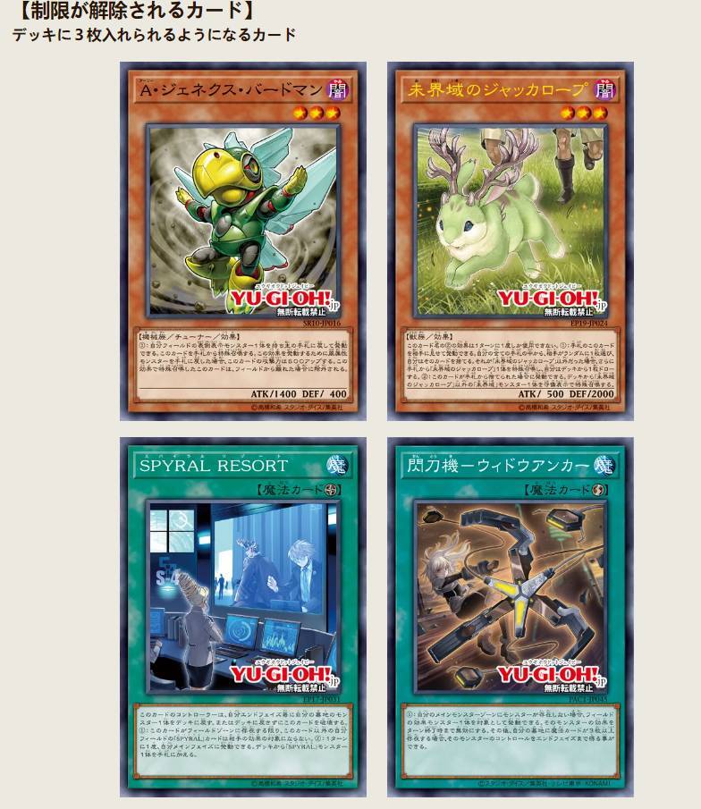 完全解除限制的卡有五张,第一张是鸟人,当初的限制原因是与核成恶魔,星见兽加里斯可以组合成“星见炮”无限削血,与霞之谷的神风配合形成的赚卡combo以及神风FTK,所以在2013年9月1日被限制。距今已过了十年。