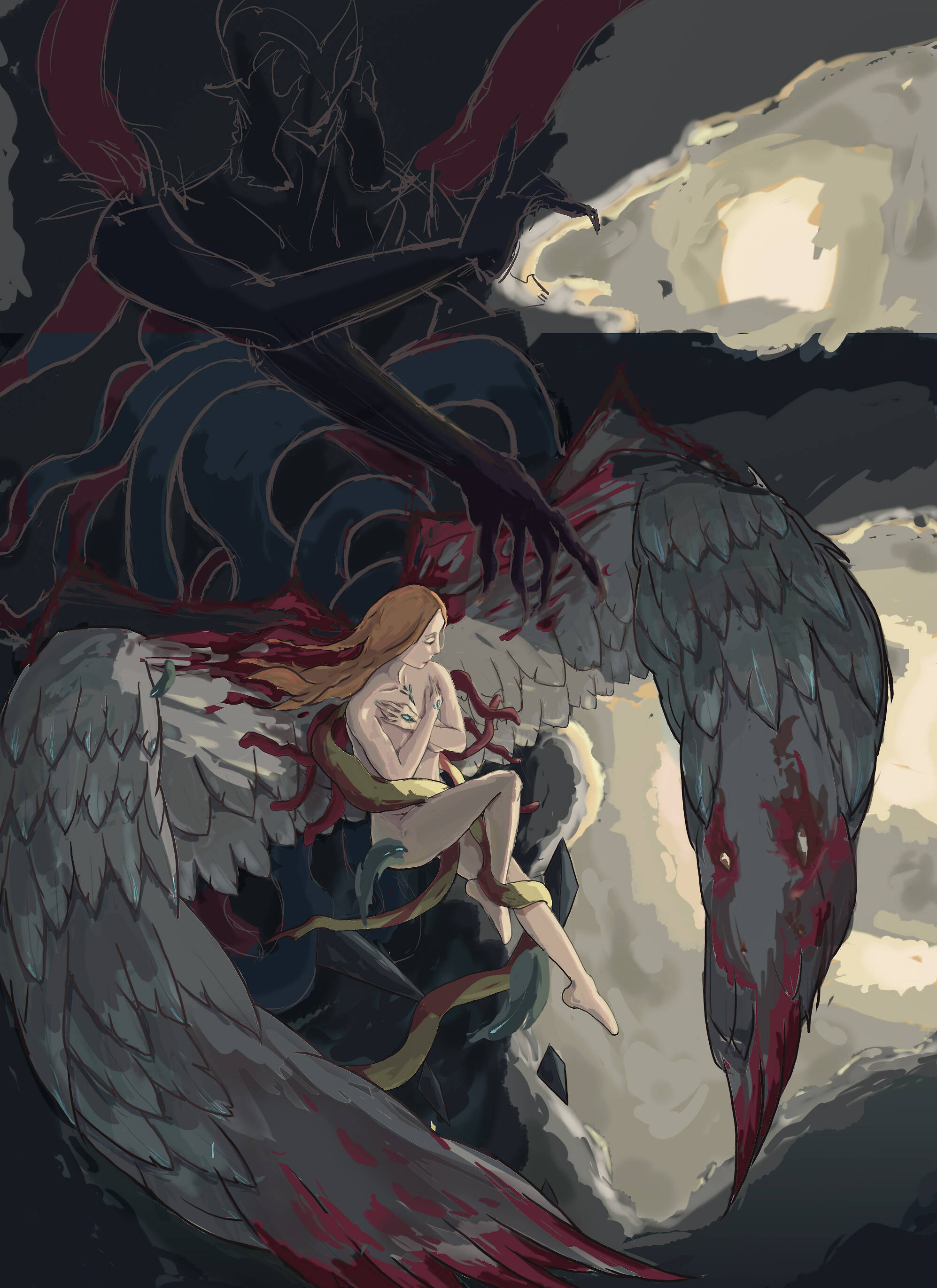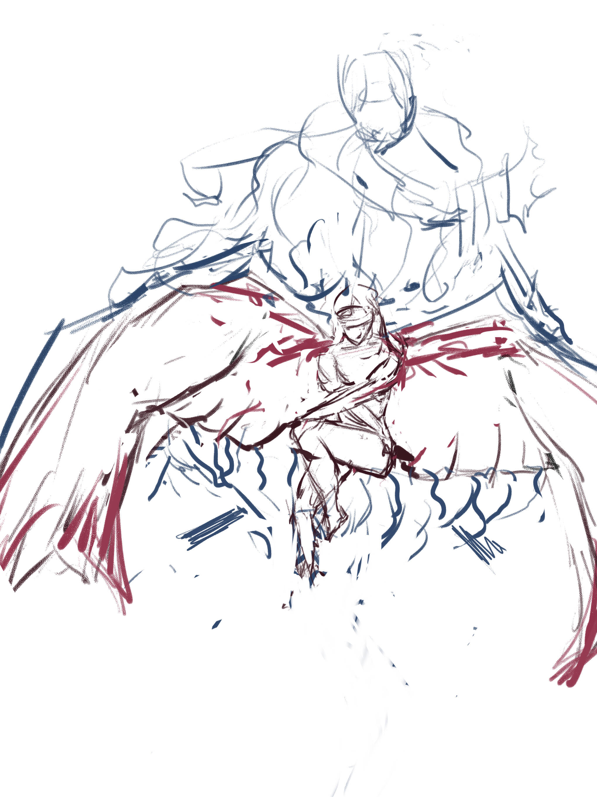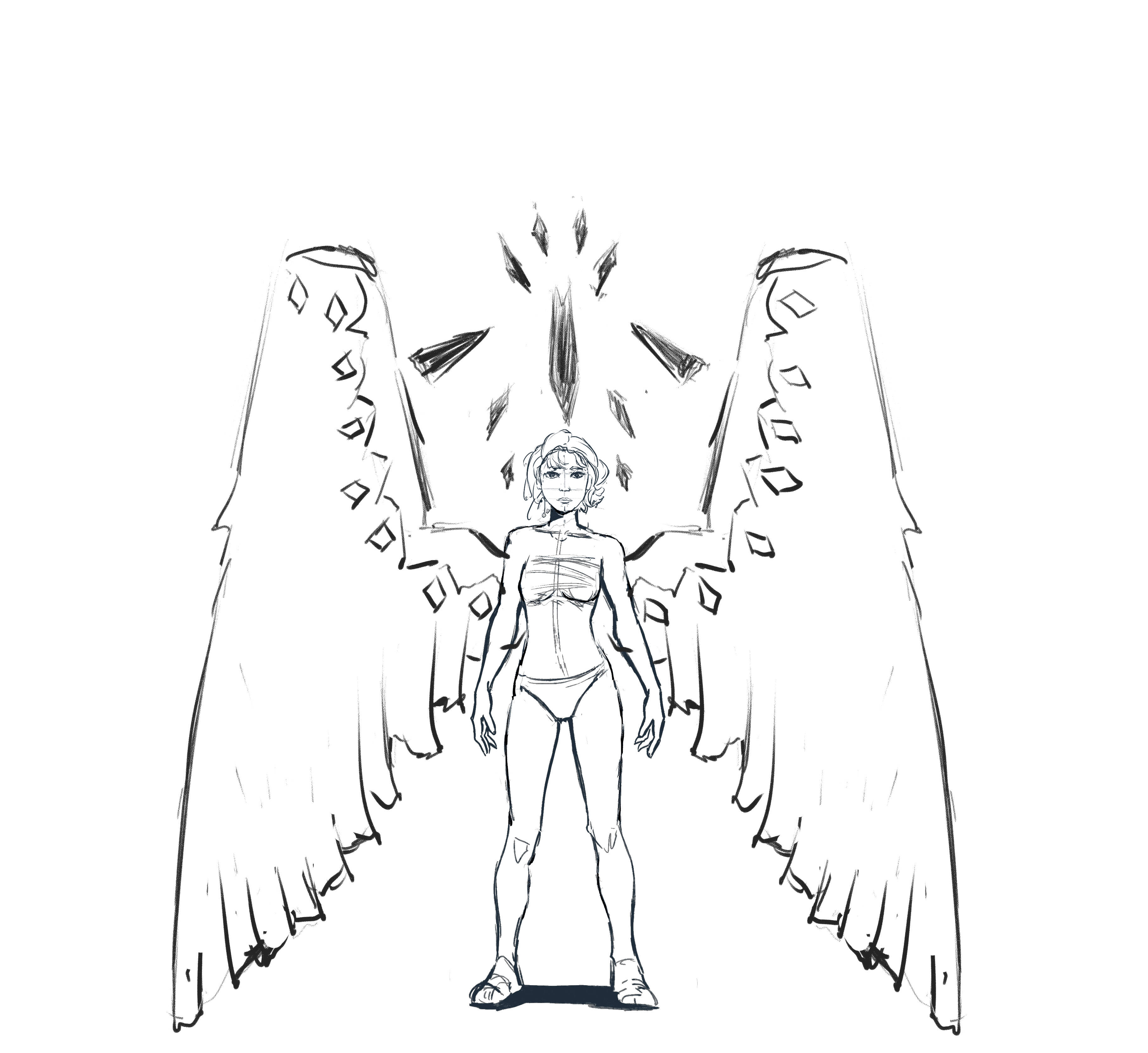 画到一半,我突然想到一个问题,按照现在这样画下去,画里的奥扎奇元素会非常少。虽然我的设定是伊莲可以随意转化翅膀形态,但是看的人是不知道的,而作为伊莲的第一张插画,我还是希望她能现出“原形”。迫不得已,我只能推倒重画。 这次我决定放大奥扎奇的元素,同时表现出伊莲本身的纯洁,因为她(现阶段)的心智还没有受到侵蚀,所以她的身体基本没有奥扎奇化。这是一些构图的设想: