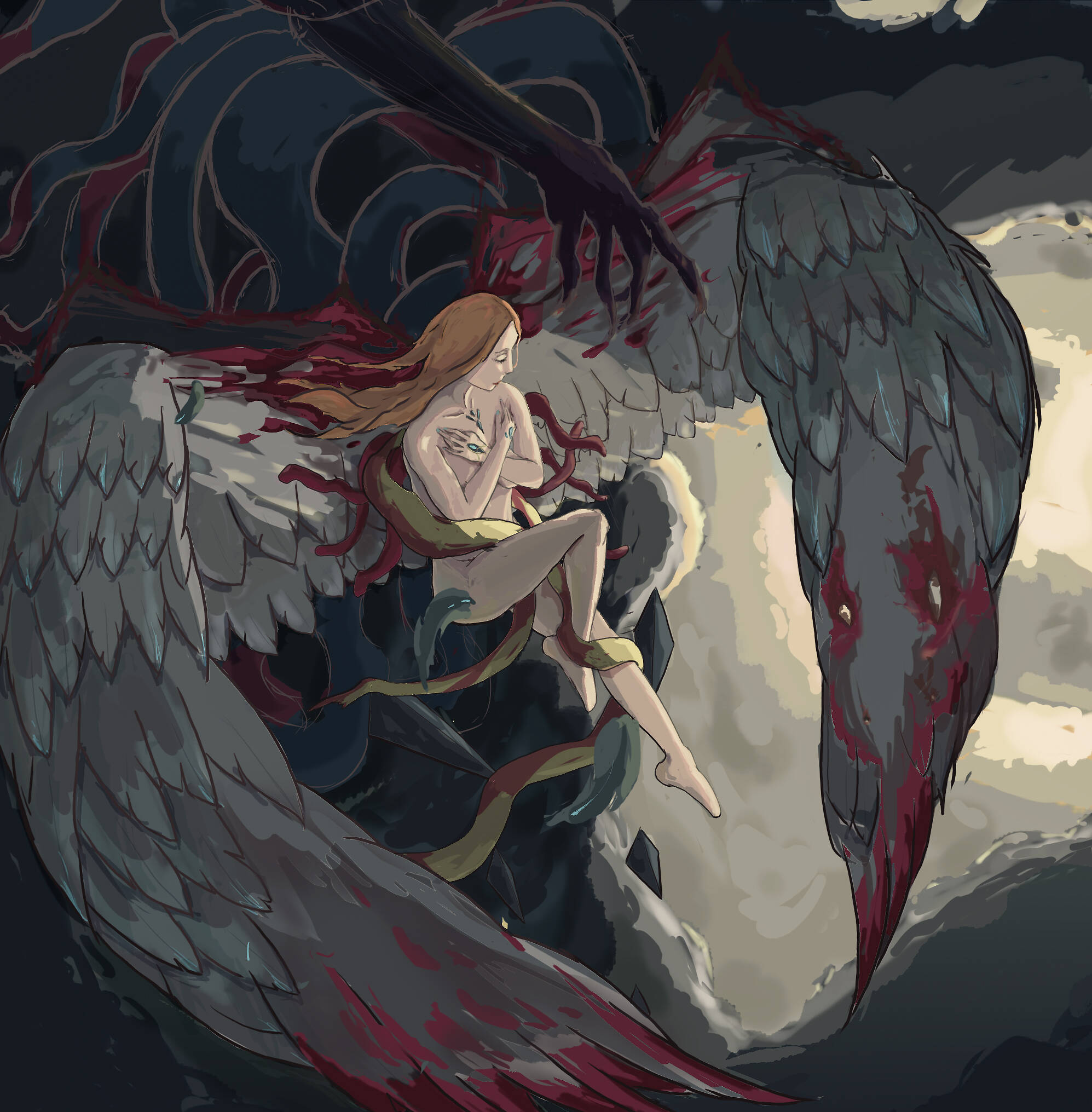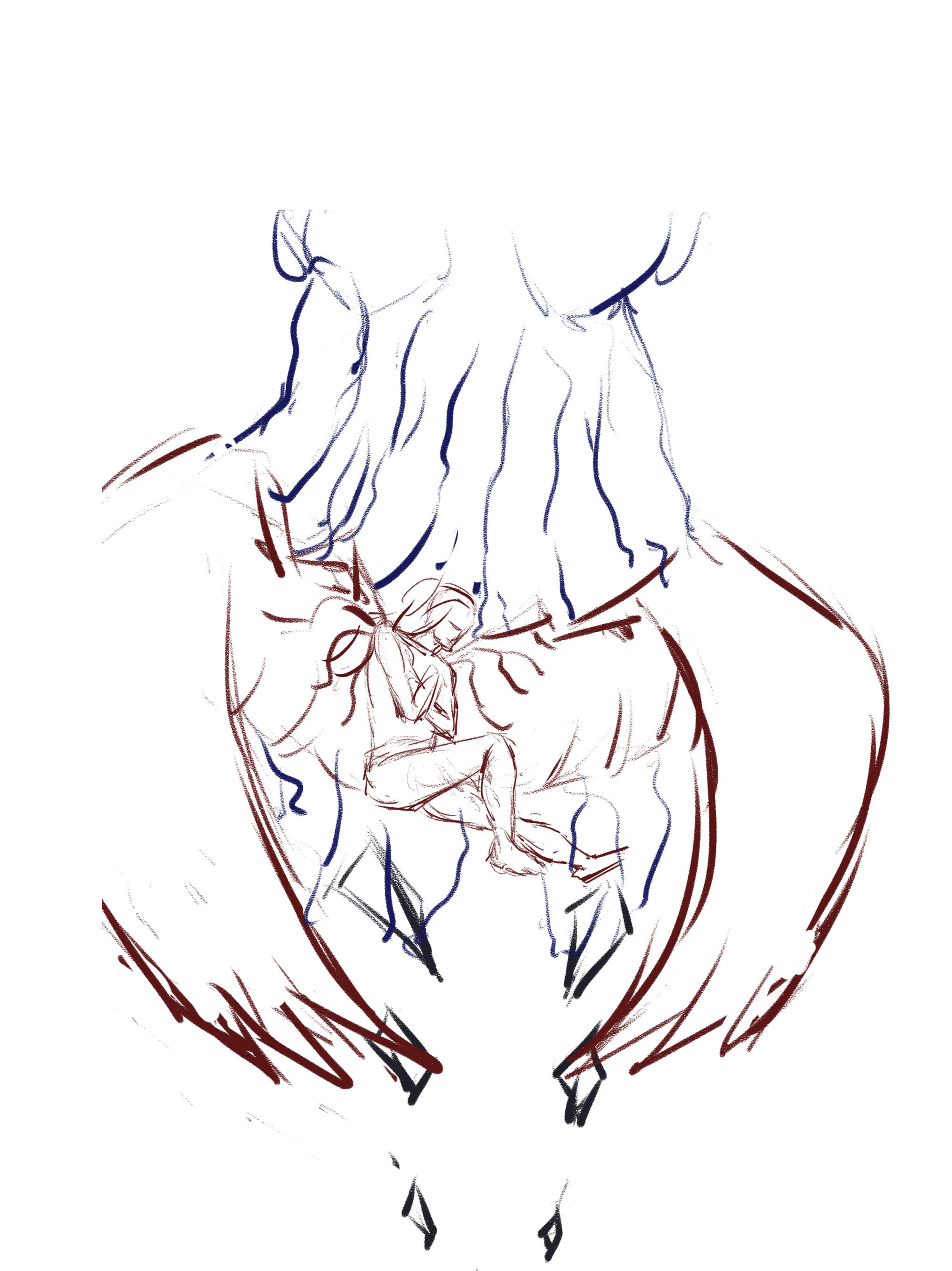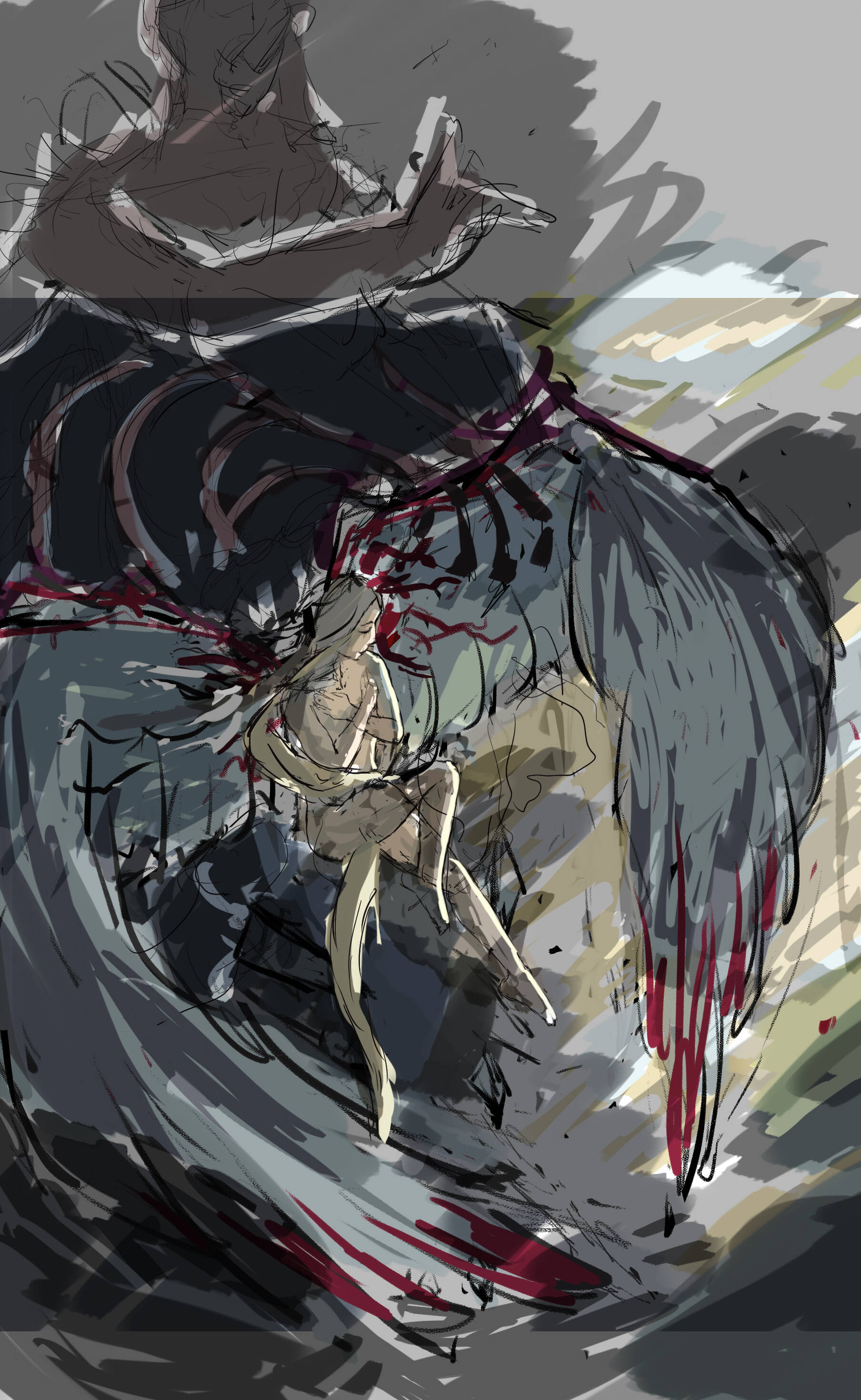 画到一半,我突然想到一个问题,按照现在这样画下去,画里的奥扎奇元素会非常少。虽然我的设定是伊莲可以随意转化翅膀形态,但是看的人是不知道的,而作为伊莲的第一张插画,我还是希望她能现出“原形”。迫不得已,我只能推倒重画。 这次我决定放大奥扎奇的元素,同时表现出伊莲本身的纯洁,因为她(现阶段)的心智还没有受到侵蚀,所以她的身体基本没有奥扎奇化。这是一些构图的设想: