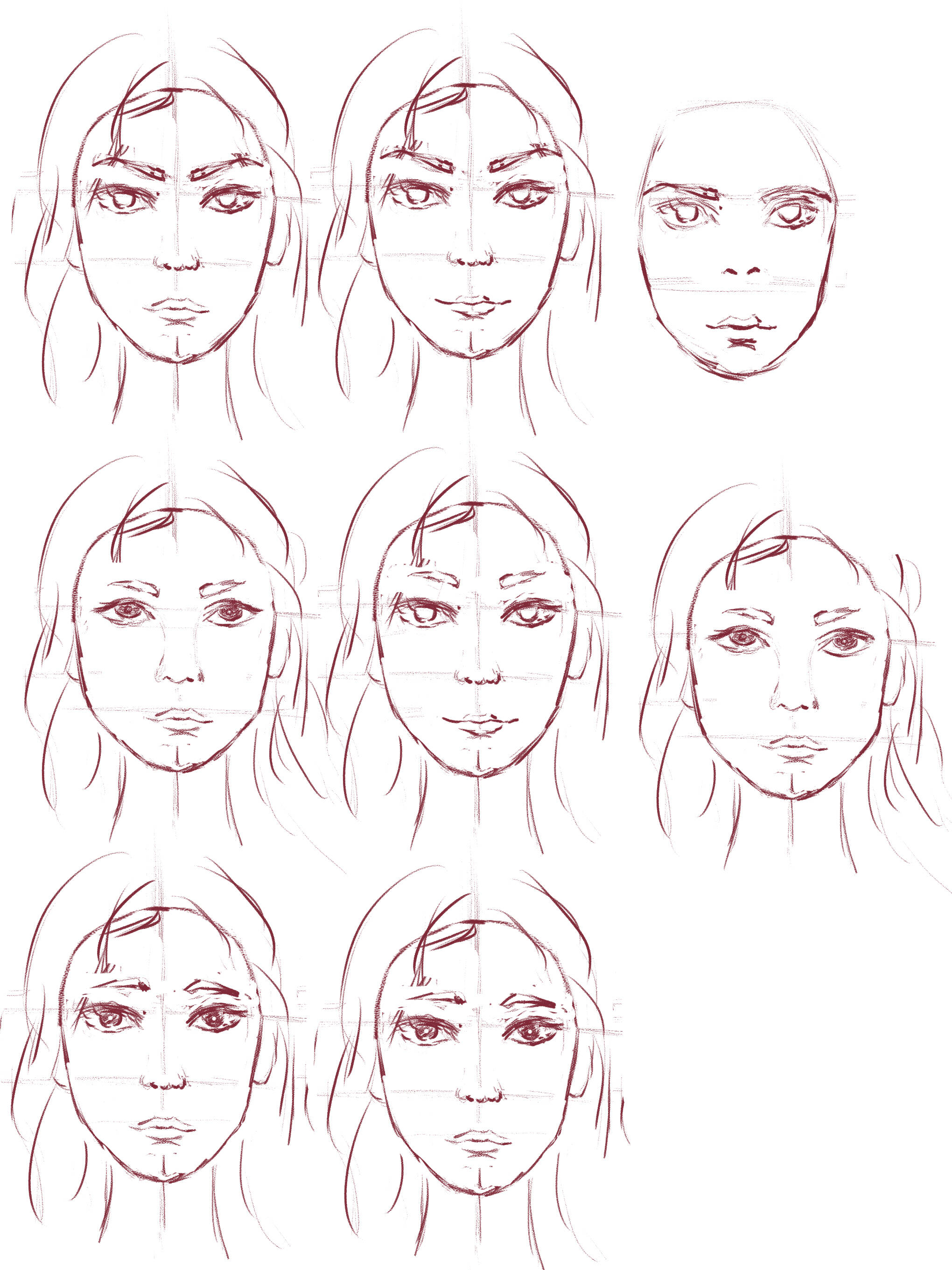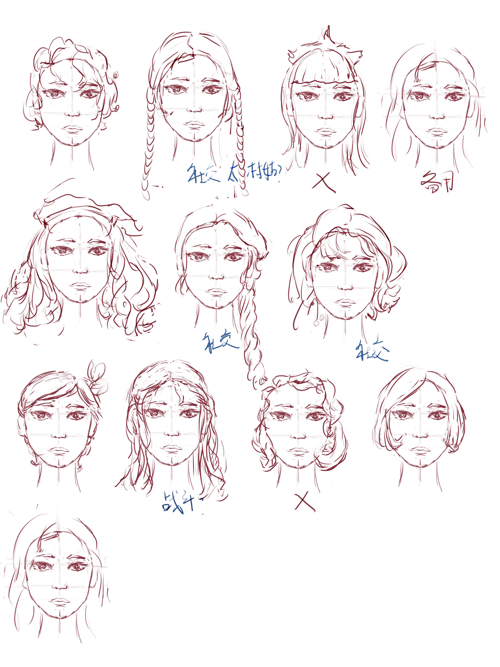 开始绘制:一开始我的想法是着重表现伊莲的青涩,将奥扎奇的一面非常隐晦的表达出来。旅法师伊莲的第一站选在了新卡佩纳,因此我打算画一张希望圣源吉娅妲那样嫩嫩的天使。我画了一些脸和发型,还找了一些art-deco风格的服饰,准备开画。