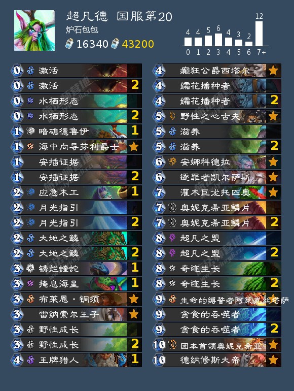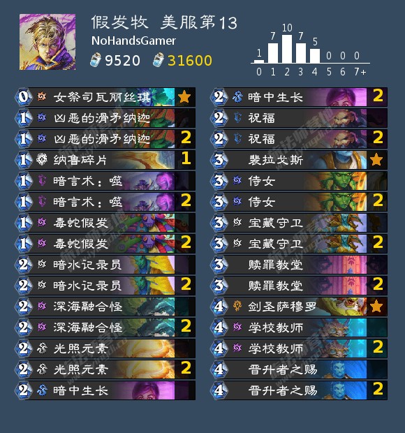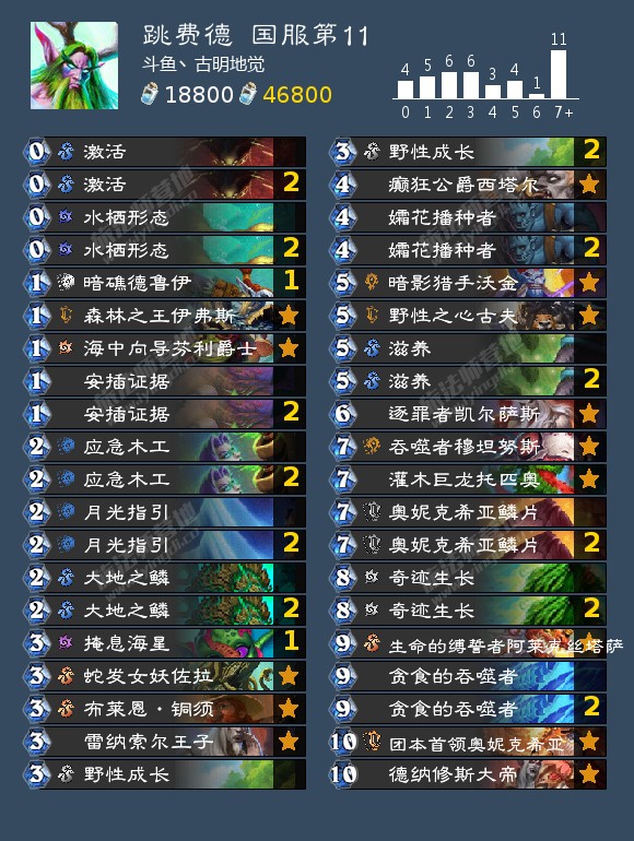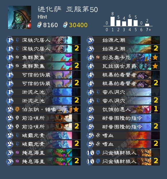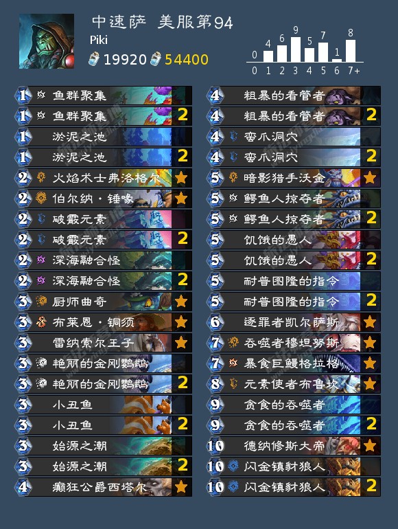 -暗礁德鲁伊、森林之王伊弗斯、海中向导芬利爵士、应急木工*2、蛇发女妖佐拉、暗影猎手沃金、逐罪者凯尔萨斯、吞噬者穆坦努斯、生命的缚誓者阿莱克丝塔萨;