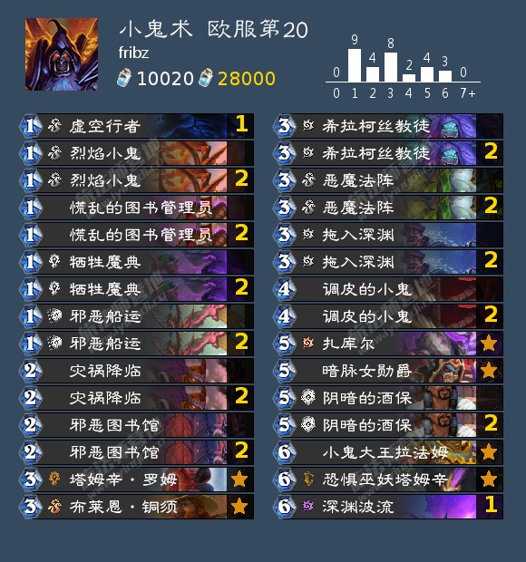 由于劣势对局奇迹贼和任务牧的泛滥,传统的铺场小鬼术和大帝小鬼术都不是很适合这个环境了。带诅咒体系的小鬼术有着更高的理论伤害上限和更强的防西塔尔能力,是现在最为主流的小鬼术分支(虽然其实也没多主流)。从构筑上来说,也隐隐有着炉石构筑中经典的“忒修斯之船”现象,开始有一些小鬼术放弃对于铺场体系非常重要的阴暗的酒保等单卡,不再是“用诅咒体系补伤害的小鬼术”,转而变得更像一套“**了小鬼来抽牌和蹭血的诅咒术”。