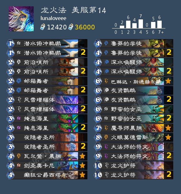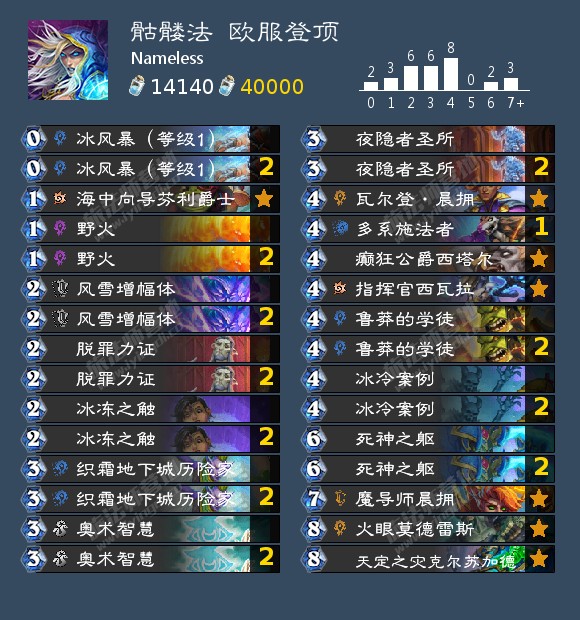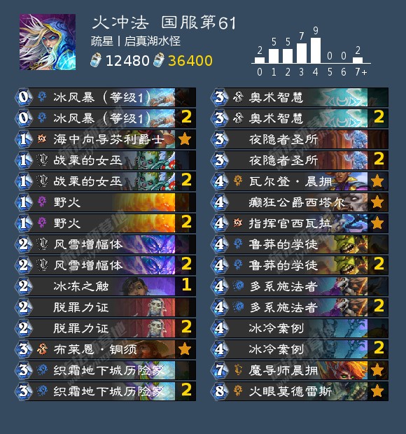 +战栗的女巫*2、布莱恩·铜须、雷纳索尔王子、深水唤醒师*2、暴风雪*2、逐罪者凯尔萨斯、群体变形、大法师的符文、德纳修斯大帝