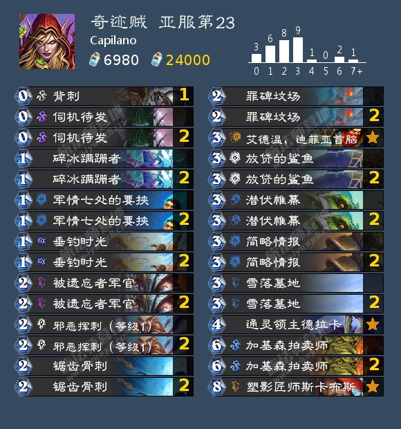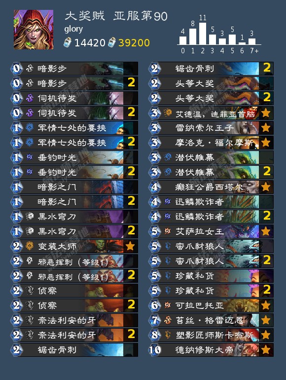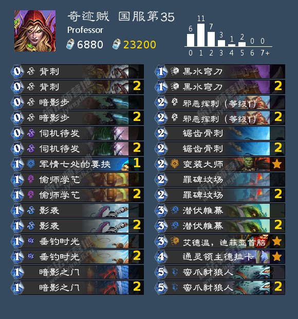 时隔不到一个月,盗贼再度回归T1。奇迹贼的构筑其实已经比较稳定了,值得讨论的只有四个卡位,可选的单卡有背刺、偷师学艺、要挟和奈法利安的牙。其实这四张卡可以分为两组,背刺和要挟由于都需要跳板,基本最多只带三张,两者之中,背刺上限更高、要挟下限更高(毕竟可以交易),作何选择全看自己的牌风。偷师学艺和奈法利安的牙之间并没有太多功能上的相似之处,纯粹是因为另两张卡分在了一起他们才会分在一起的……这两者其实都挺需要上限,前者对于启动刷牌没有太多意义,因此带上它就意味着对于自己启动的概率以及启动之后的牌序较为自信;后者在绝大多数对局中都只想看到术士或者猎人的技能(血线危机了才可能拿叠甲或者奶2),因此带上这张卡对于发现技能这件事情较为自信。不过在我看来,偷师学艺既可能有抽牌润滑作用(找术士技能)又不是那么影响启动刷牌,而且还可能提供一定的回复能力,更适合现在的奇迹贼。
