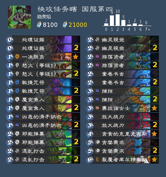 -怒火(等级1)*2、邪能弹幕*2、幽灵视觉、奥达奇战刃*2、赛丝诺女士、捕掠*2、艾萨拉女王、杰斯·织暗;