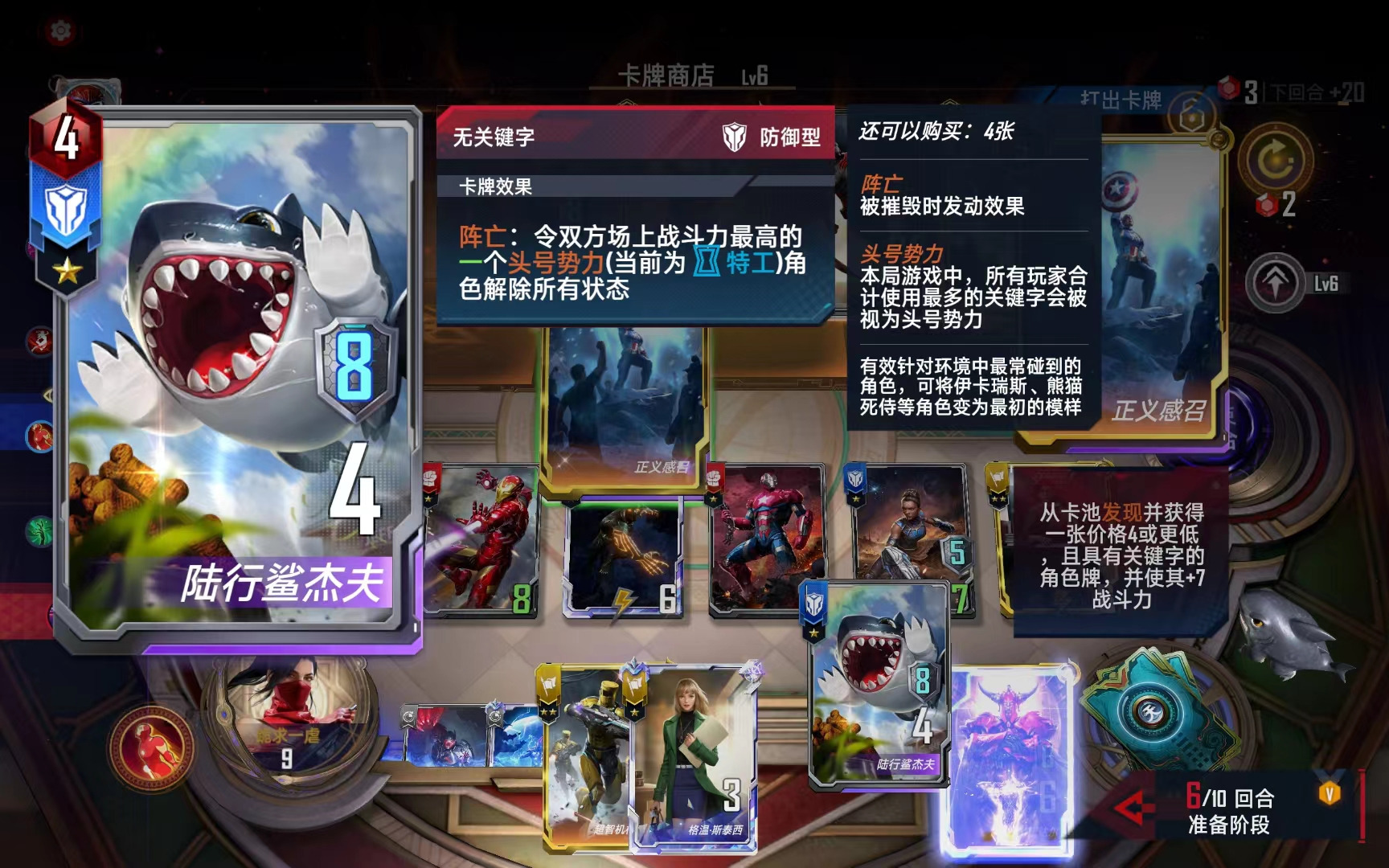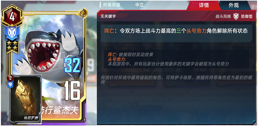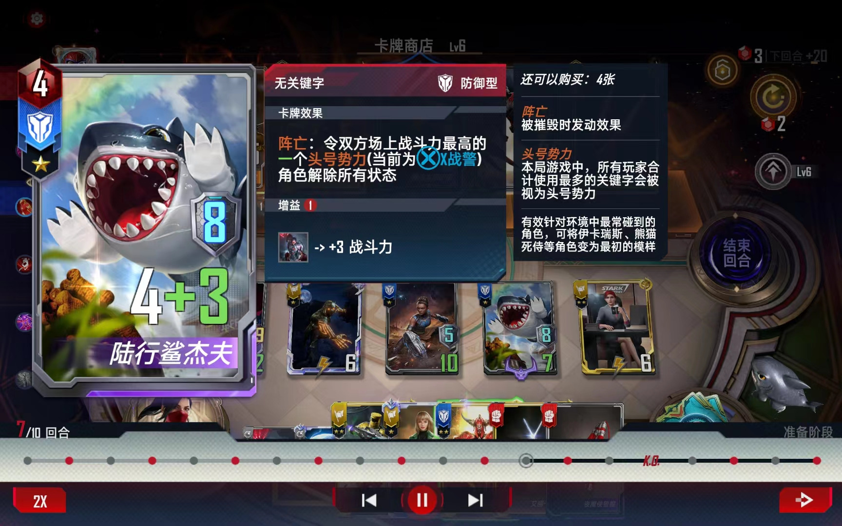 2、头号势力解释:场上“剩余存活玩家”的关键字最多的角色卡,比如下面这场比赛,第六回合陆行鲨的头号势力是“特工”,第七回合就变成了“x战警”