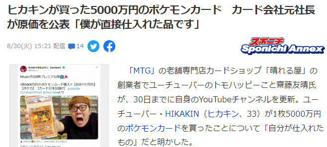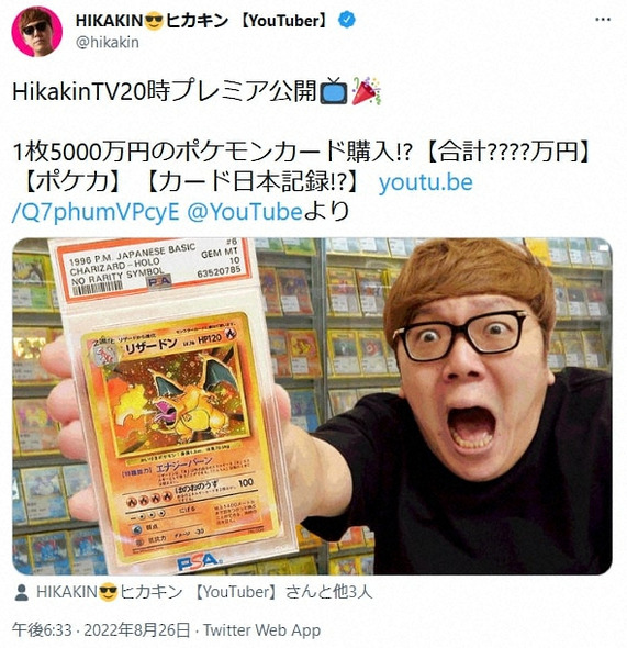 在油管主播榜常年排名前三甲的岛国顶级网红HIKAKIN近日豪掷5000万日元购得一张宝可梦卡引发热议,其购买方卡主晴屋原社长斋藤30日更新信息,透露了这批珍贵宝可梦卡的收购原价,160万~180万日元,虽然也不便宜,不过比起5000万日元那是真的涨价的玄乎了。