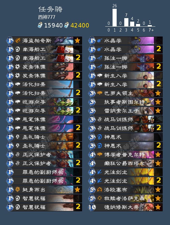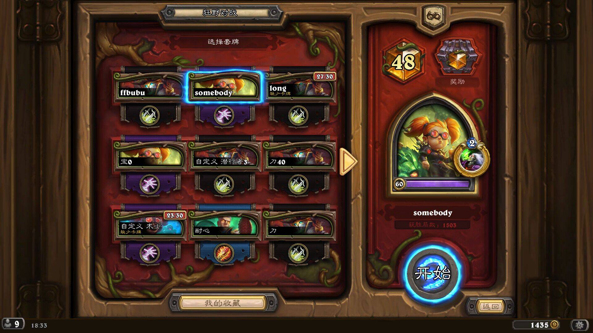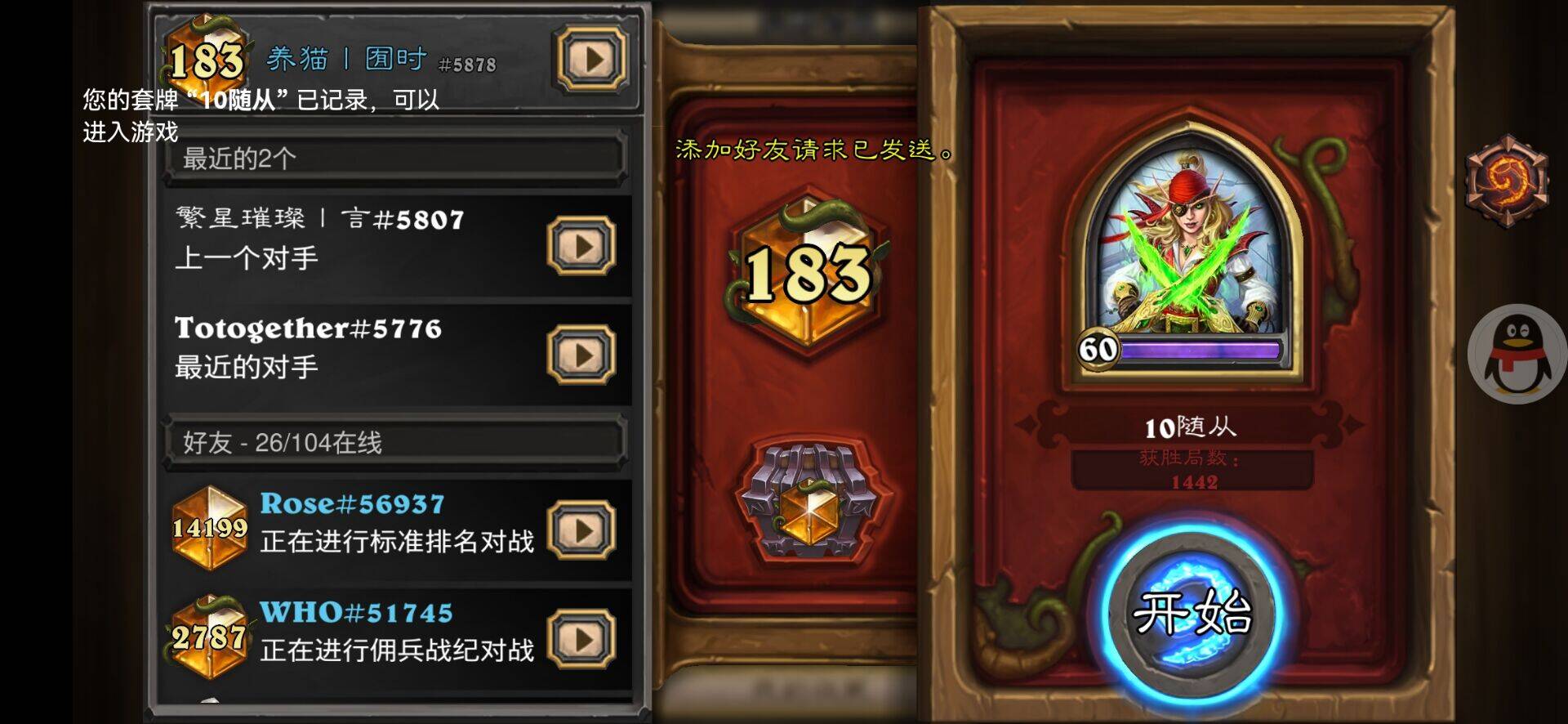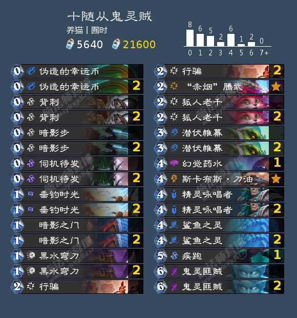 今天的卡组是弑君贼、诅咒术、剑鱼贼、小鬼术、鬼灵贼、任务骑、激怒战、偶数萨。