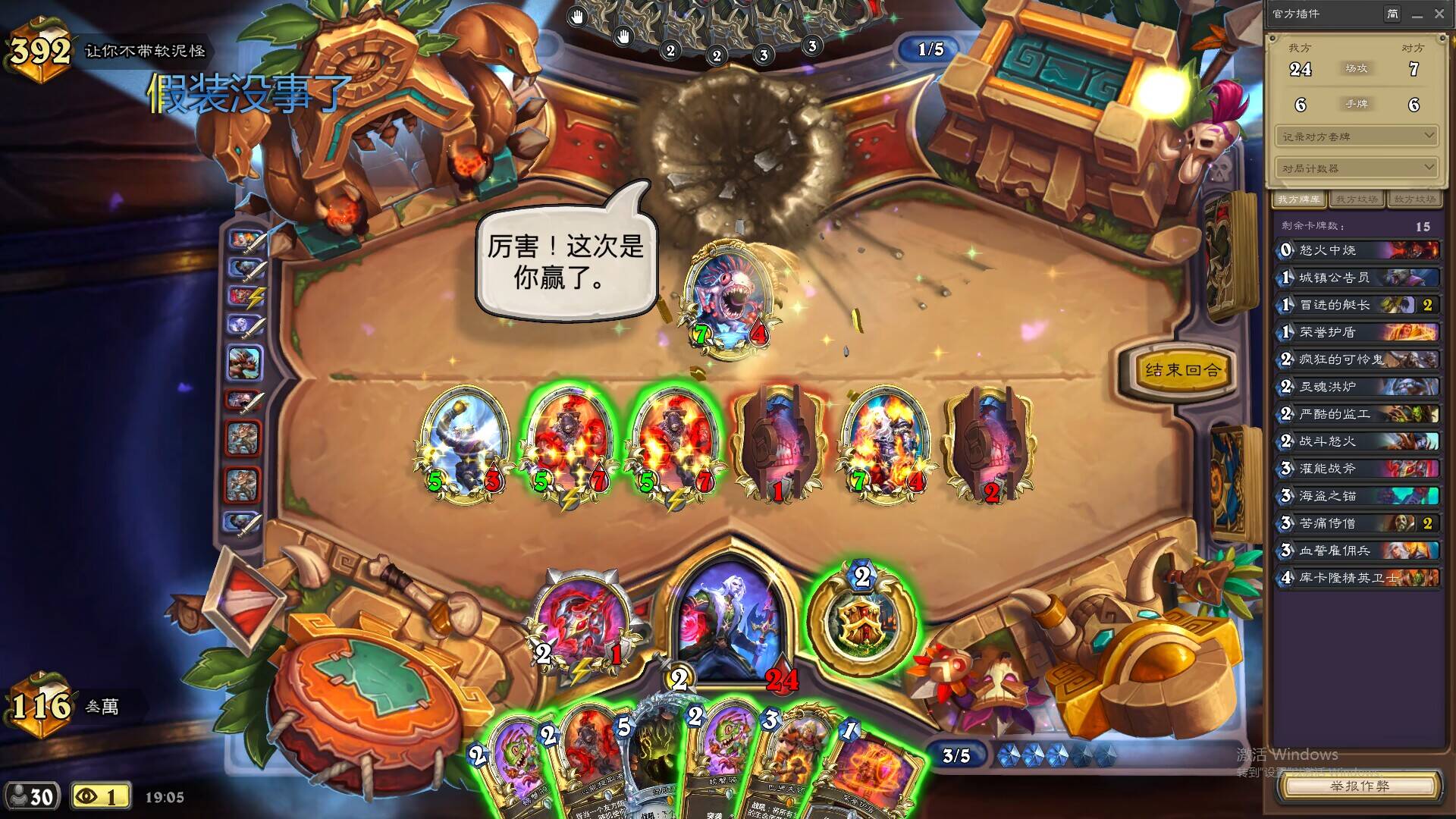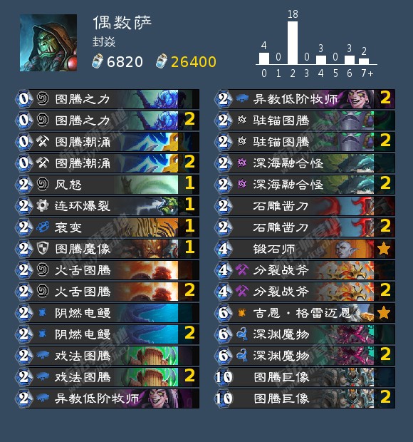 第二,我这套卡的MVP就是我满编的“戏法图腾”,想必有很多人会觉得这张牌太**了,万一出了负面效果不就gg了。我想说绝对不是这样的,狂野3费以下的优质法术实在太多了,光奥秘就几乎已经顶了一半,还不算“堆肥”“奥数智慧”等过牌神卡还有各种buff卡可以配合,甚至还有危机四伏痛苦诅咒破宇宙的罕见情况。在我玩了100多把下来,我可以说戏法图腾给的法术是绝绝对对是物超所值的,就算偶尔打了负收益的卡也无伤大雅,我有次被打了战略转移,结果反而意外的让我能提前上场双图腾巨像并拿下对局。
