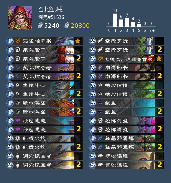 来自骚男#51536的一套朴素的剑鱼贼,他使用这套卡组以217场64%胜率打到了85名。