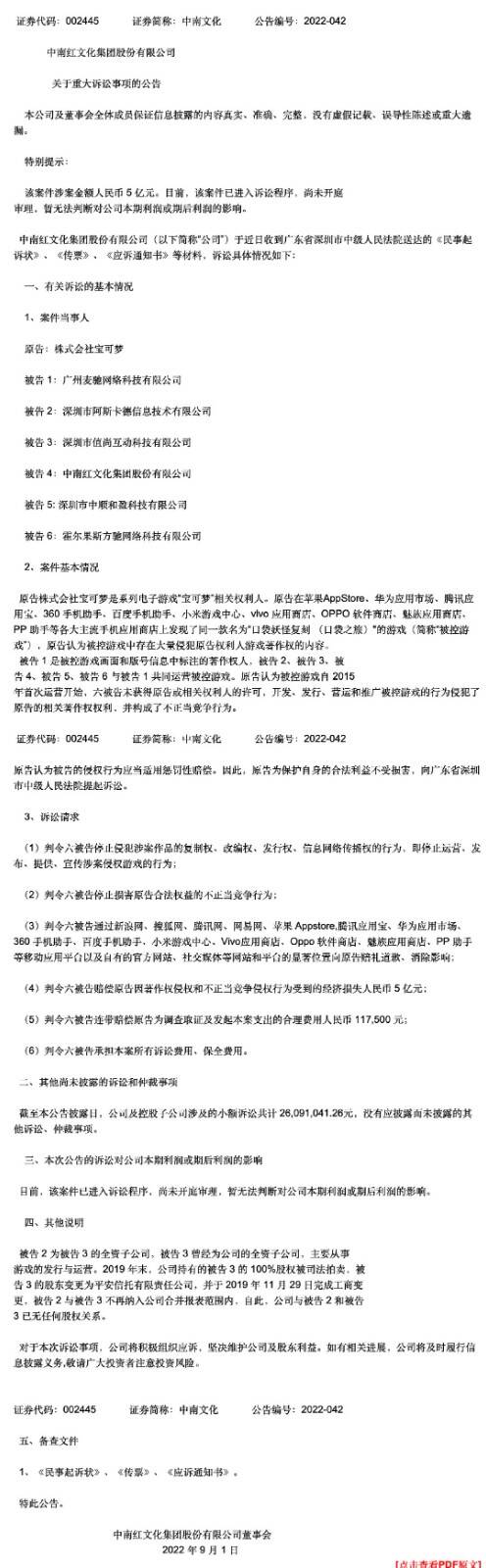 根据中南文化8月31日的公告,株式会社宝可梦现已向广东省深圳市中级人民法院提起诉讼,被告为包括中南文化在内的六家“口袋妖怪复刻(口袋之旅)”运营方,该案件涉案金额高达5亿元人民币,目前已进入诉讼程序,尚未开庭审理。