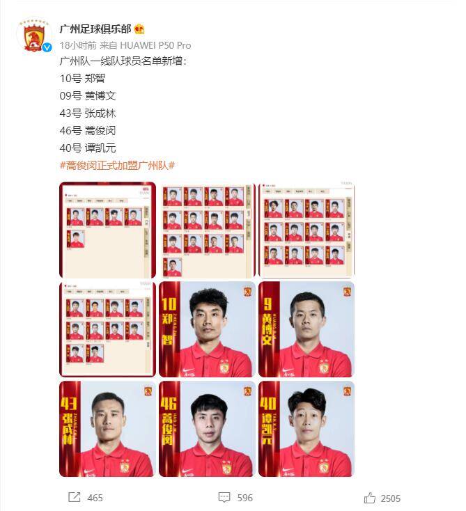 近日,广州足球俱乐部公布了一线队球员新增名单:最为瞩目的就是主帅郑智出现球员名单中,身披10号球衣,助理教练黄博文身披9号球衣,体能教练张成林身披43号球衣。此外蒿俊闵也正式加盟广州队,身披46号球衣。