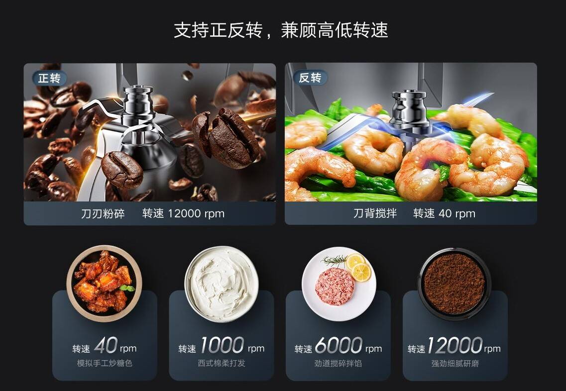 米家烹饪机器人内置广速域磁阻电机,40-12000rpm宽广转速,支持正反转,刀刃粉碎、刀背搅拌,甚至还能用40rpm转速模拟手工炒汤色。