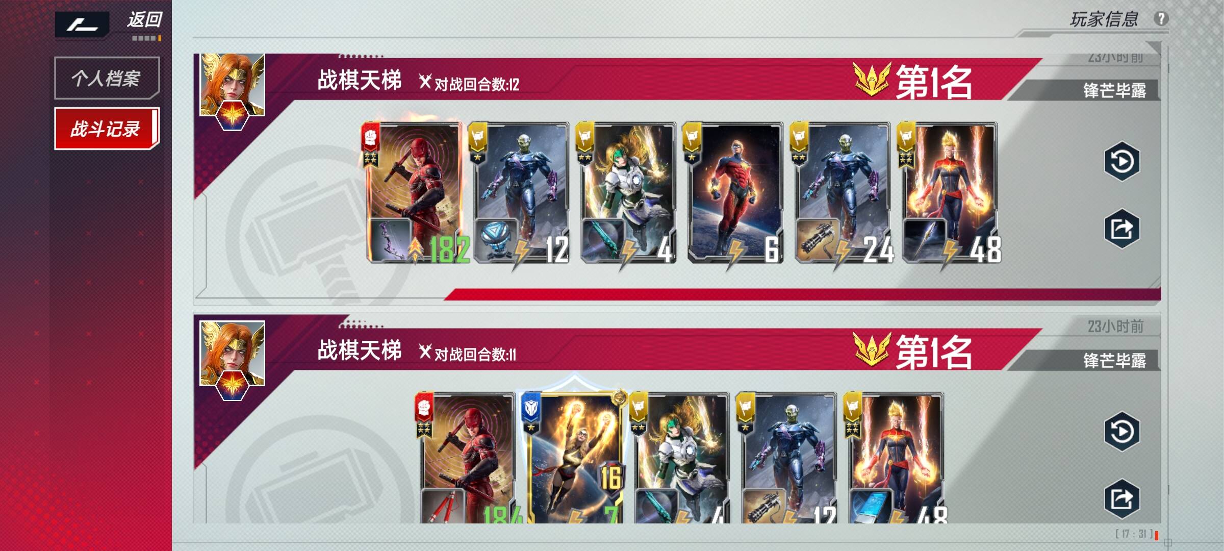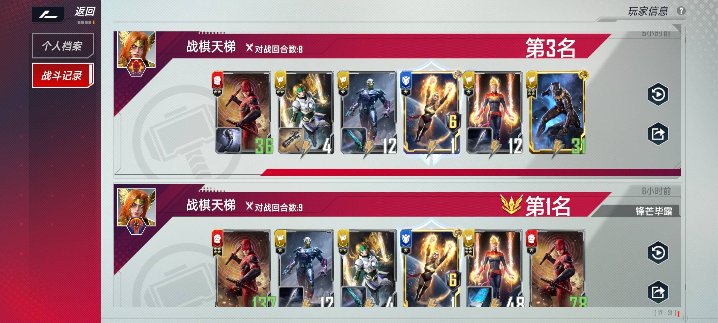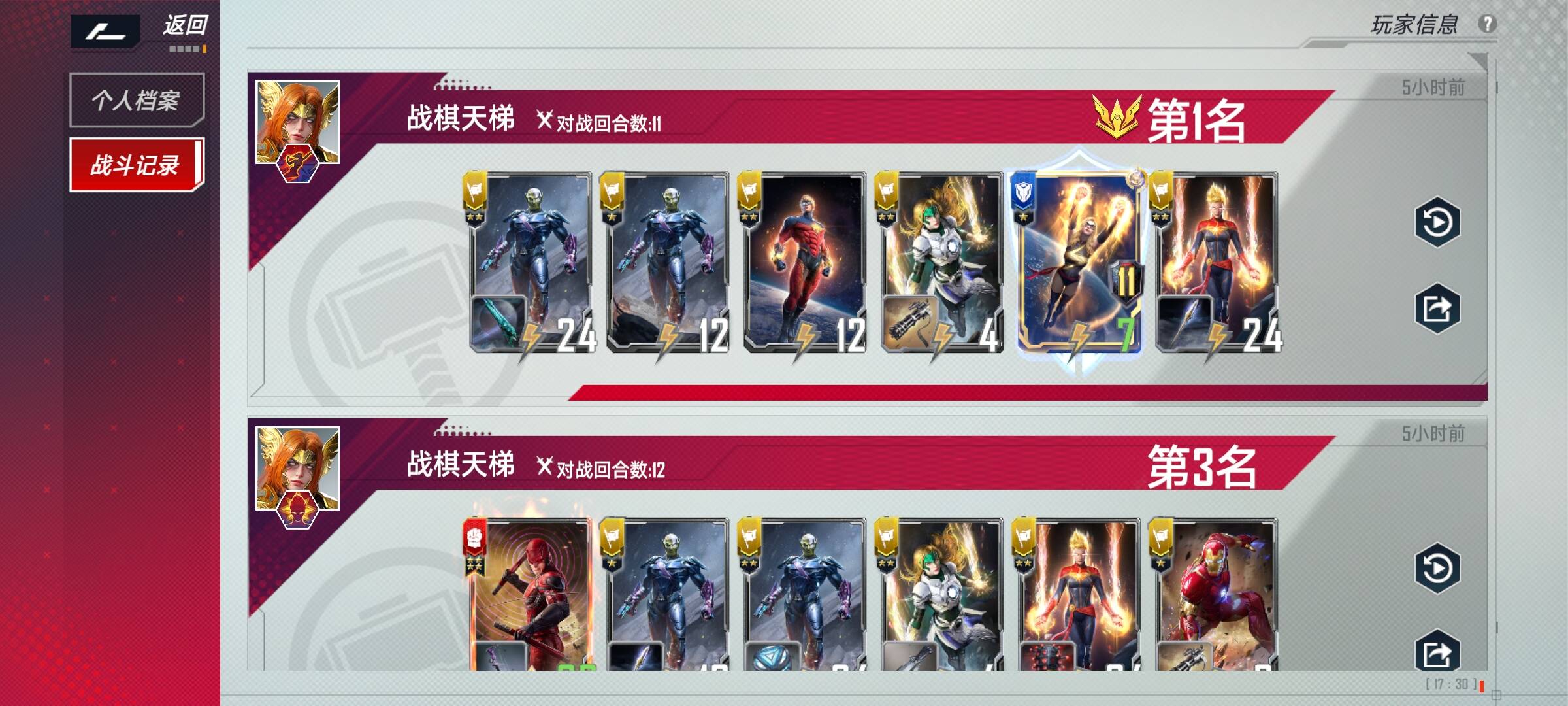 2、在以上情况下我选择钢铁侠、艾丽卡、惊奇队长作为英雄,钢铁侠的佩珀波兹、假面夫人,中立金钱豹作为血魔卡组的老三样是必带的,最好是满4,佩珀波兹和金钱豹带2也可,稳血我选择夜魔侠和玛丽埃尔,玛丽埃尔在实战中真的很强,带2即可,夜魔侠在本卡组起到的作用是前期稳血后期锦上添花,能4则4,不能4的话5本也要进行升本,我带了4个超智机构士兵,这个和本卡组十分契合,经济也是赚到飞起,不用强求4,场上格子不够可以卖掉。