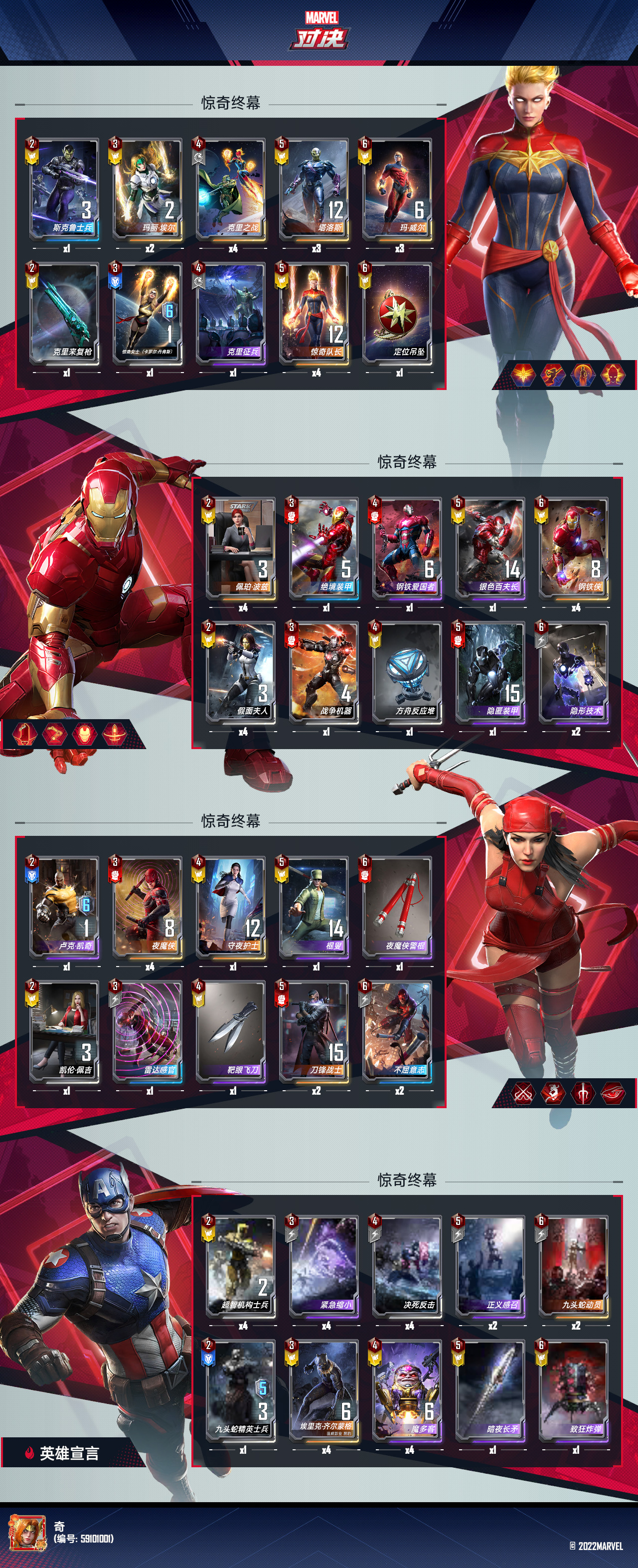 1、1-2回合买完就行,第一回合武器不要买,3-5回合最好是把假面夫人和夜魔侠满4,不满也没关系,第五回合直升五本,此时假面夫人尽量全在场上,夜魔侠可以正义感召补齐,在第6回合的时候开始看场上的情况,进行打缩小,缩小是我们很重要的经济点和血量点,前期不要乱交,可以留给二本红、闪暴寡、妇联等中期强势卡组,成型之后上6本找马维尔,找到马维尔后多买武器,因为惊队下来是没有武器的,手里有武器,惊队可以多次上天。
