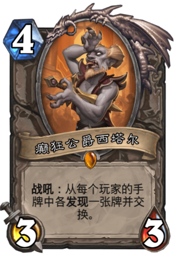 然后是**法,鄙人不才,以前还写过**法的卡组推荐,我觉得算是文艺复兴了。法师卡组是很难决定带30张还是40张,我会投30一票,但我有个问题,大家法师30 VS 40内战时,英雄牌谁先上手?我怎么老是对面40的先上手?关键是我换手手换过来以后,我自己带的抽上来显得很浪费,就建议暴雪再出一张卡,战吼:发现你的手牌中一张牌和对手的手牌中一张牌,然后交换。这样我把我的英雄牌给对面,避免浪费,这么大公无私的牌,身材超模一点吧,就3费44吧。