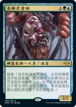 - 在备牌局,无断片密探在有锐敏的时候,可以在翻出锐敏后手里没有其他倾曳源时,用锐敏异能把无断片密探放在牌库顶,然后通过欧娜斯或者醒转暗礁的异能抓上手。