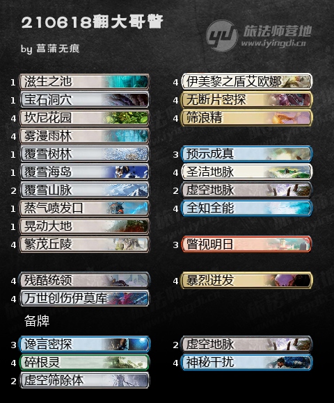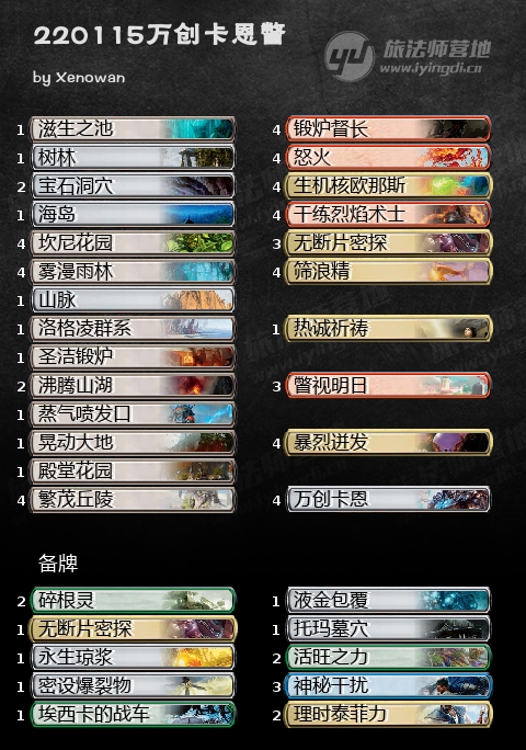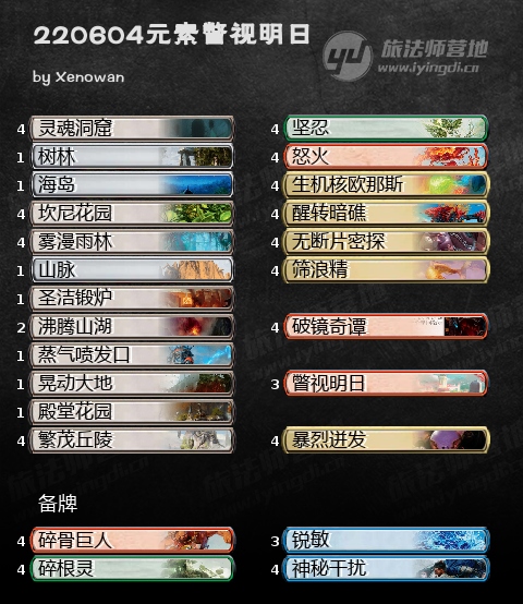 - 怎么铺:保留经典的坎尼花园与筛浪精,同时通过醒转暗礁与套牌中的大量元素配合获得更多的地,用地来获得瞥视明日的永久物数。(Xenowan的版本有奇奇结界铺场能力更强)