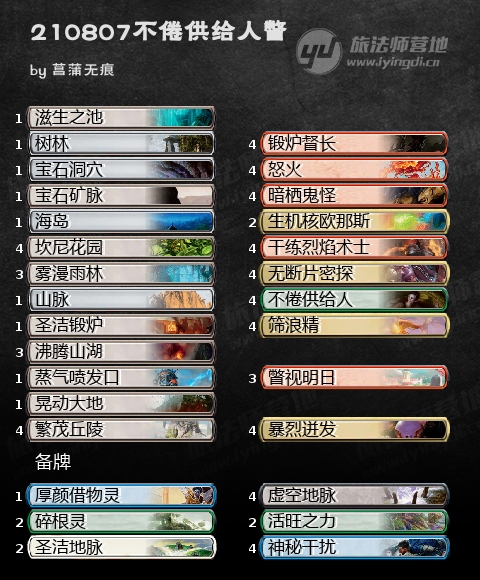虽然从现在看来这牌的构筑非常粗糙,但坎尼花园和筛浪精这两个后面所有瞥视明日都会放满的润滑剂已经加入历史舞台,而地脉,也是瞥视明日各个版本中,非常常见的备牌选择。可以说在提升套牌稳定性这个维度已经找到了一些初步的方向。