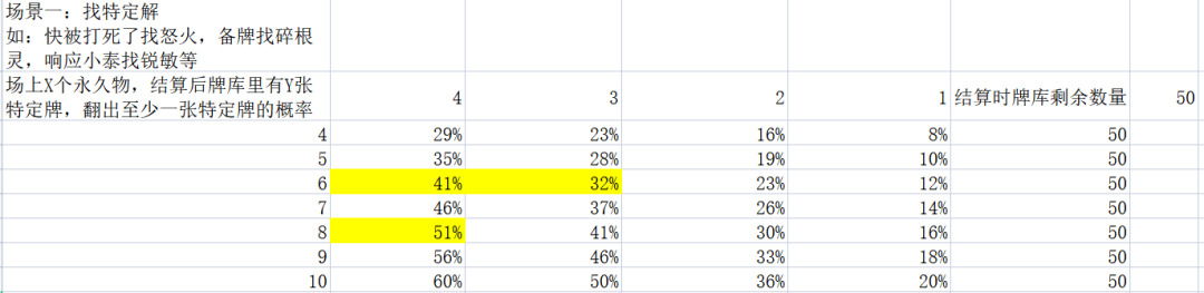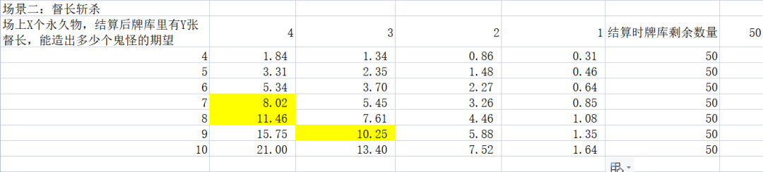 - 虽然在起手有多张督长可能很厉害,但是根据督长斩杀计算表格我们会知道,多一张督长在牌库里的收益是大于多一个永久物本身的。而多一个永久物在场能增加5%左右翻出特定单卡(督长以外)的概率。我认为在多数情况下不应该保留2个督长在手的起手。哪怕是倾向于PLAN A的对局。在调度后将督长放回是很好的选择。