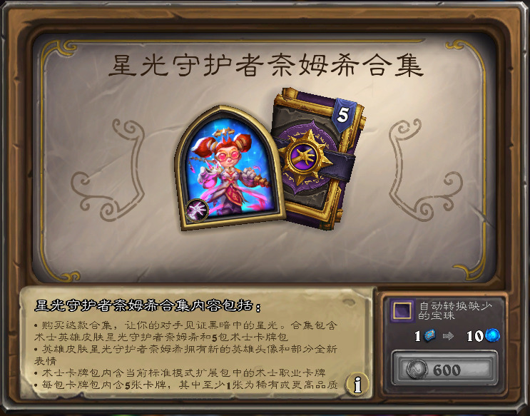 含构筑术士新皮肤“星光守护者奈姆希”和5术士包,国服售价60。