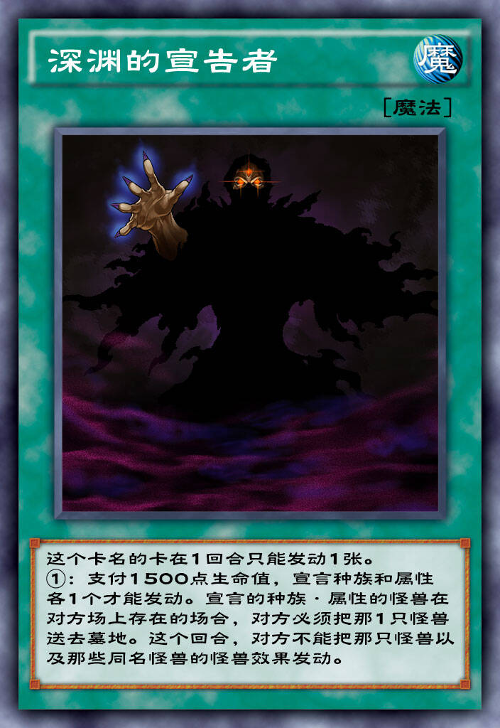 支付1500基本分,宣言种族和属性各1个才能发动。宣言的种族·属性的怪兽在对方场上存在的场合,对方必须把那1只怪兽送去墓地。这个回合,对方不能把那只怪兽以及那些同名怪兽的怪兽效果发动。 非常强力的解场卡,支付1500血可以触发决斗链接大部分需要扣血才能发动的技能,推荐抽1-2张.