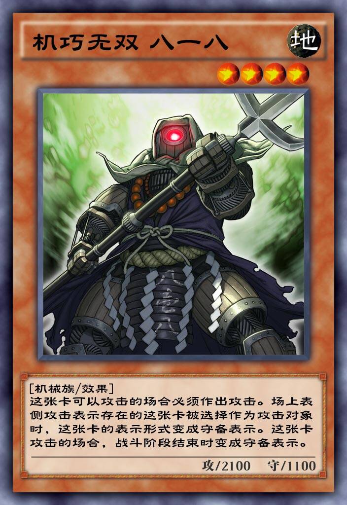 这张卡可以攻击的场合必须作出攻击。场上表侧攻击表示存在的这张卡被选择作为攻击对象时,这张卡的表示形式变成守备表示。这张卡攻击的场合,战斗阶段结束时变成守备表示。 八一八配合二二四可以同步目前唯一的本家机巧将军无零,然后从卡组直接拉怪,进行解场或者斩杀.