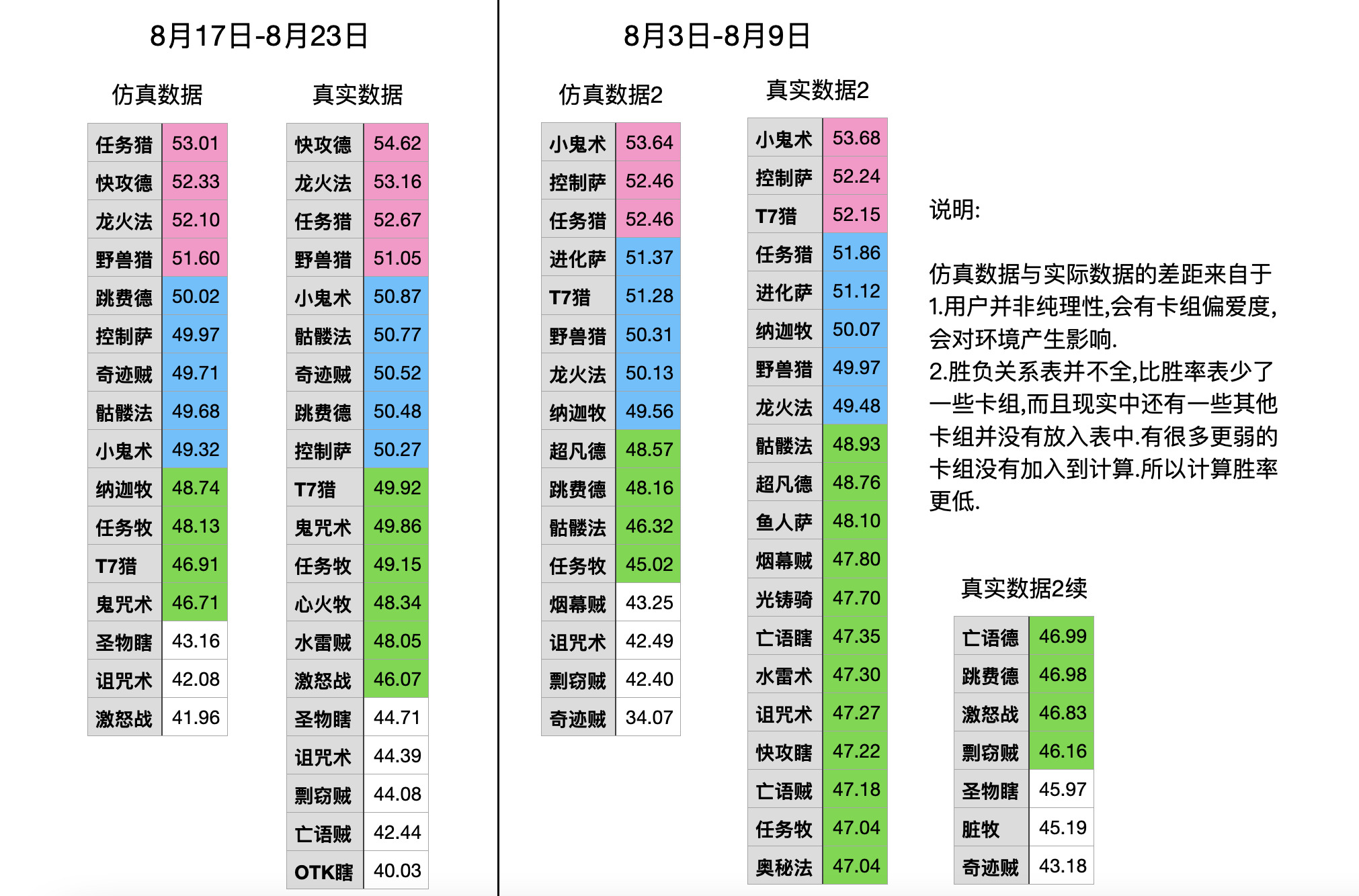 大部分还是准确的.但是有几点需要说明 1.用户并非纯理性,会有卡组偏爱度,会对环境产生影响. 2.胜负关系表并不全,比胜率表少了一些卡组,而且现实中还有一些其他卡组并没有放入表中.也有很多更弱的卡组没有加入到计算.所以计算胜率更低.