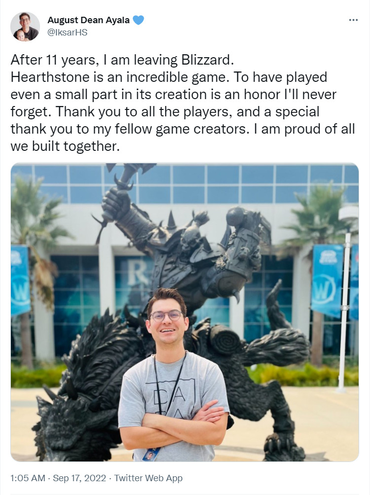 不夸张地说,Iksar对炉石社区来说即使不是最有名,也至少是多年来人们听到得最多的名字了。从竞技场到平衡性,从游戏设计到内容规划,从设计师到管理者,我们听了他一路的采访发言和推特问答,送给他(至少国服)最响亮的名号和表情包;从质保员到设计师,再到首席,再到游戏总监,我们也见证了他完完整整的炉石晋升之路。甚至说是成家立业的人生道路也不为过。