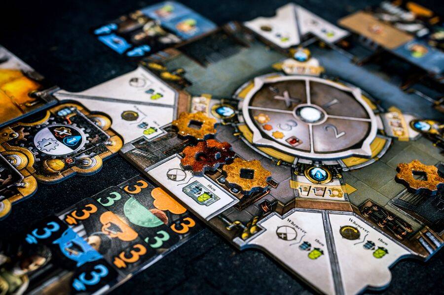 游戏可以支持1到4人进行,开局前准备好自己的玩家版图、工厂版图、起始卡牌、标记,以及中央区公用的各种板块、配件。
