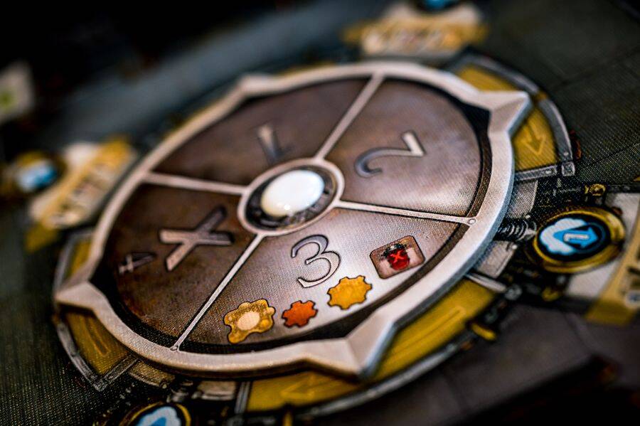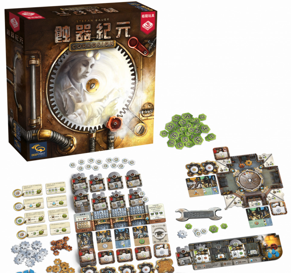 而每位玩家还有一块工厂版图,这个版图是四方形,并被对角线交叉分割为4个扇区。在工厂中间有一个转盘被成为 锈蚀轮,上面标示有1、2、3、X,标志着对应扇区的名称。当 锈蚀轮 转动的时候,意味着扇区的名称也会随之发生改变。