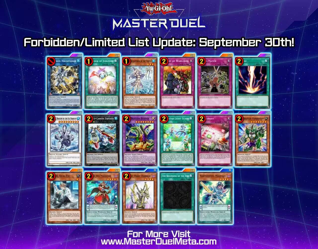 圣殿的水遣(2→1)这次也是同步OCG的表,作为一个落地带圈的强力wai gua系列,勇者系统的7卡带康小系统,因为没有本家自肃而且带康,被称为“展开的守护神”而活跃于各种各样的卡组,上一次它把调皮宝贝、魅影骑士团都给玩了进去,这一次终于把自己玩了进去。不过k社现在还是手下留情了,阿拉弥赛亚之仪和狮鹫骑手这两张卡还是没动。但是鉴于OCG的狮鹫骑手已经是禁止卡了,可想而知,在md里这一天应该也不会太远。