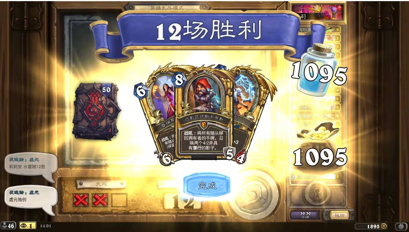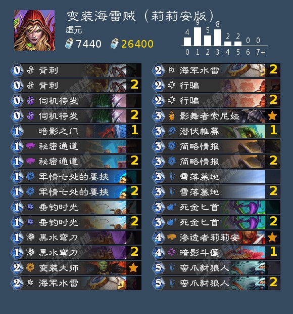 来自虚元的一套剑宗变装海雷贼,他使用这套卡组在英雄乱斗模式中打出了12-2的战绩,并在本月使用这套卡组打到天梯12名。