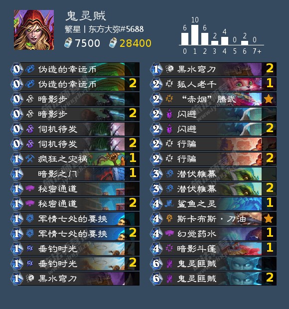 来自繁星丨东方大弥#5688(原id说说书生)的鬼灵贼,他使用这套卡组打出了101场68%胜率的战绩,并以28场75%的胜率打进月榜。