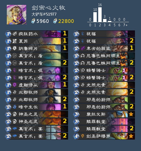 来自大铲车#51977的剑宗心火牧,他使用这套卡组以106场56%胜率打到了狂野300名左右,在英雄乱斗模式中打出了12-2的战绩。