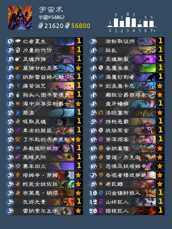来自半藏#54862的一套宇宙术,他使用这套卡组在月榜分段打出了20名65%胜率的战绩。