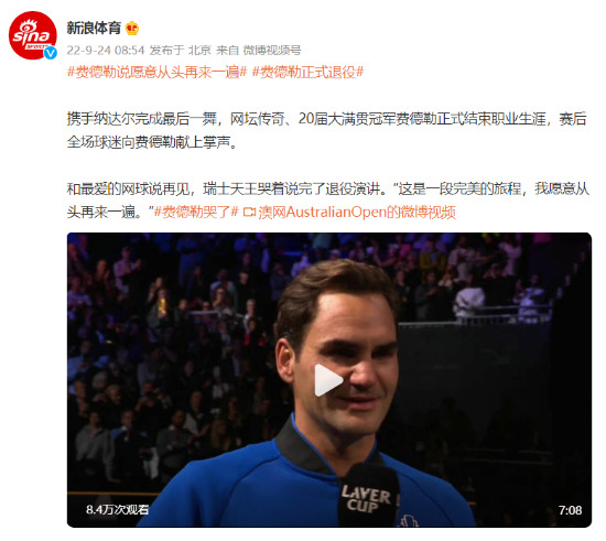 和最爱的网球说再见,瑞士天王哭着说完了退役演讲。“这是一段完美的旅程,我愿意从头再来一遍。