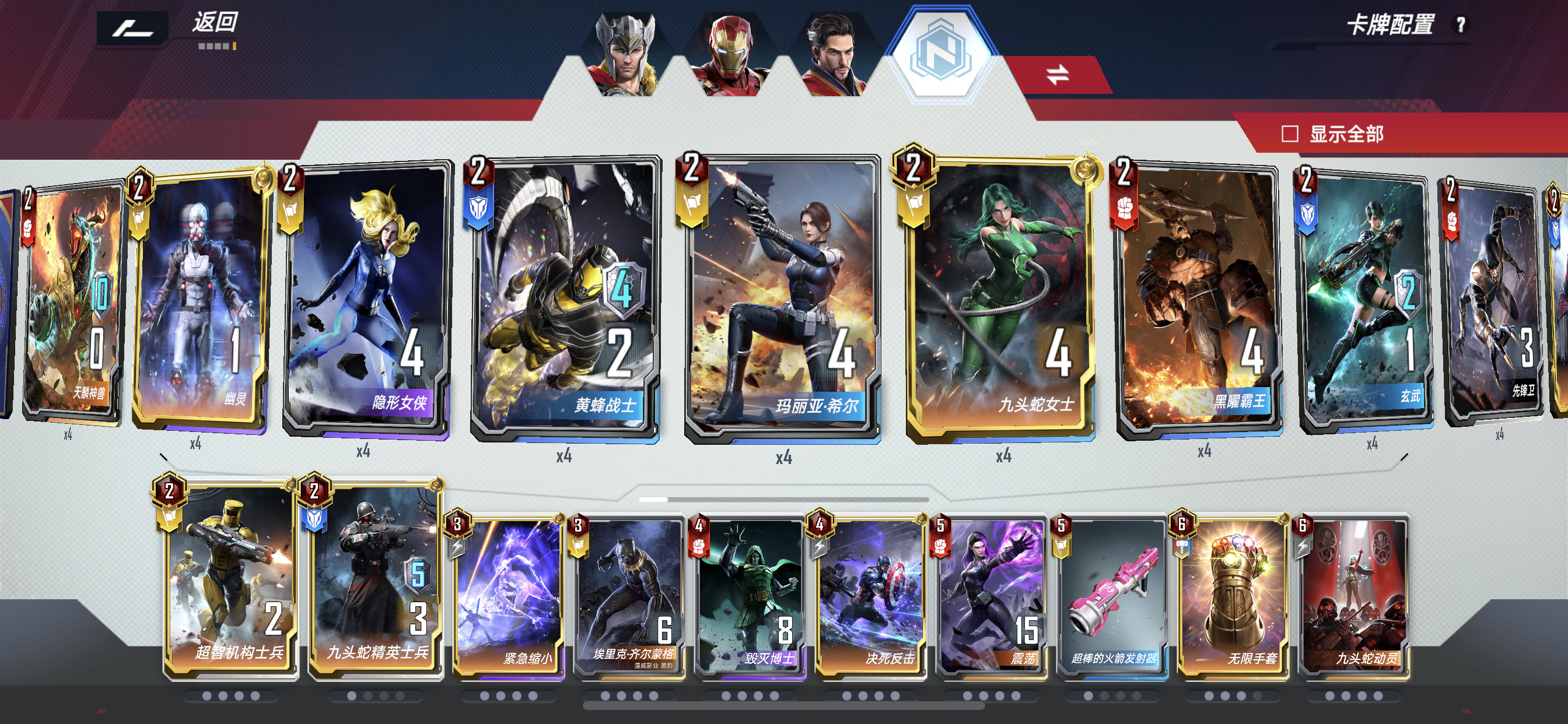 九头蛇动员用来找6费武器,克制小小死侍。打死侍鸭子怎么处理呢?看缘分吧,比如对面女死侍炸死我的两个角色,毁灭博士就可以解决了,但是不稳定,打死侍不算优势,我自己感觉是55开,看各自摸牌吧。