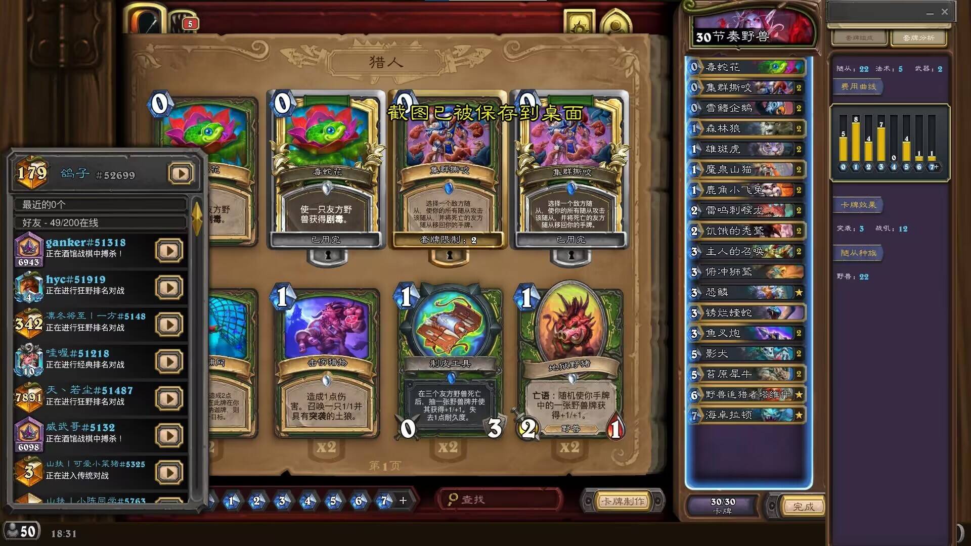 来自Heard的任务野兽猎,它使用这套卡组打到第15名(退坑考研),山扶丨挽筝祈风和夏宁不住宁夏(两个人几乎没有操作野兽猎的经验)抄了这套卡组,共打出了30场70%的胜率。