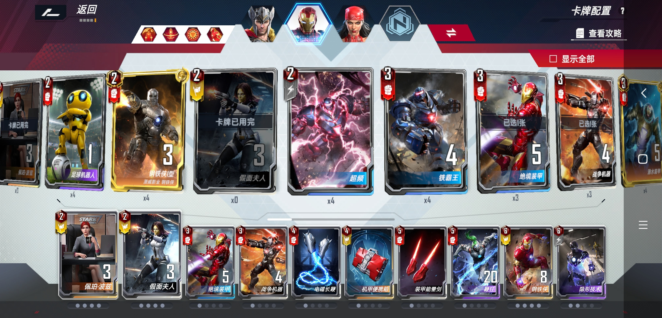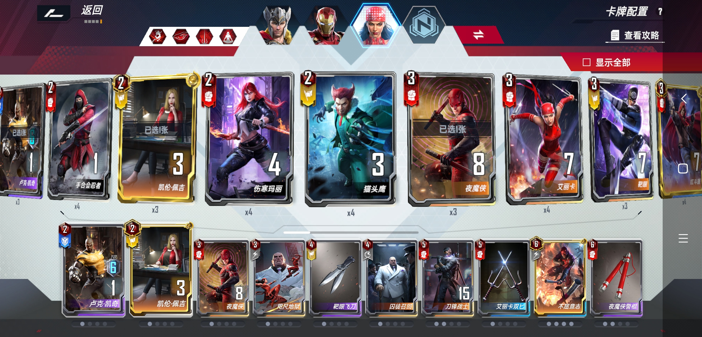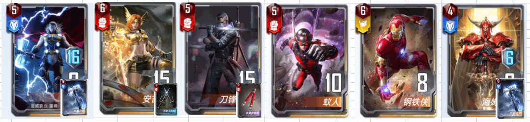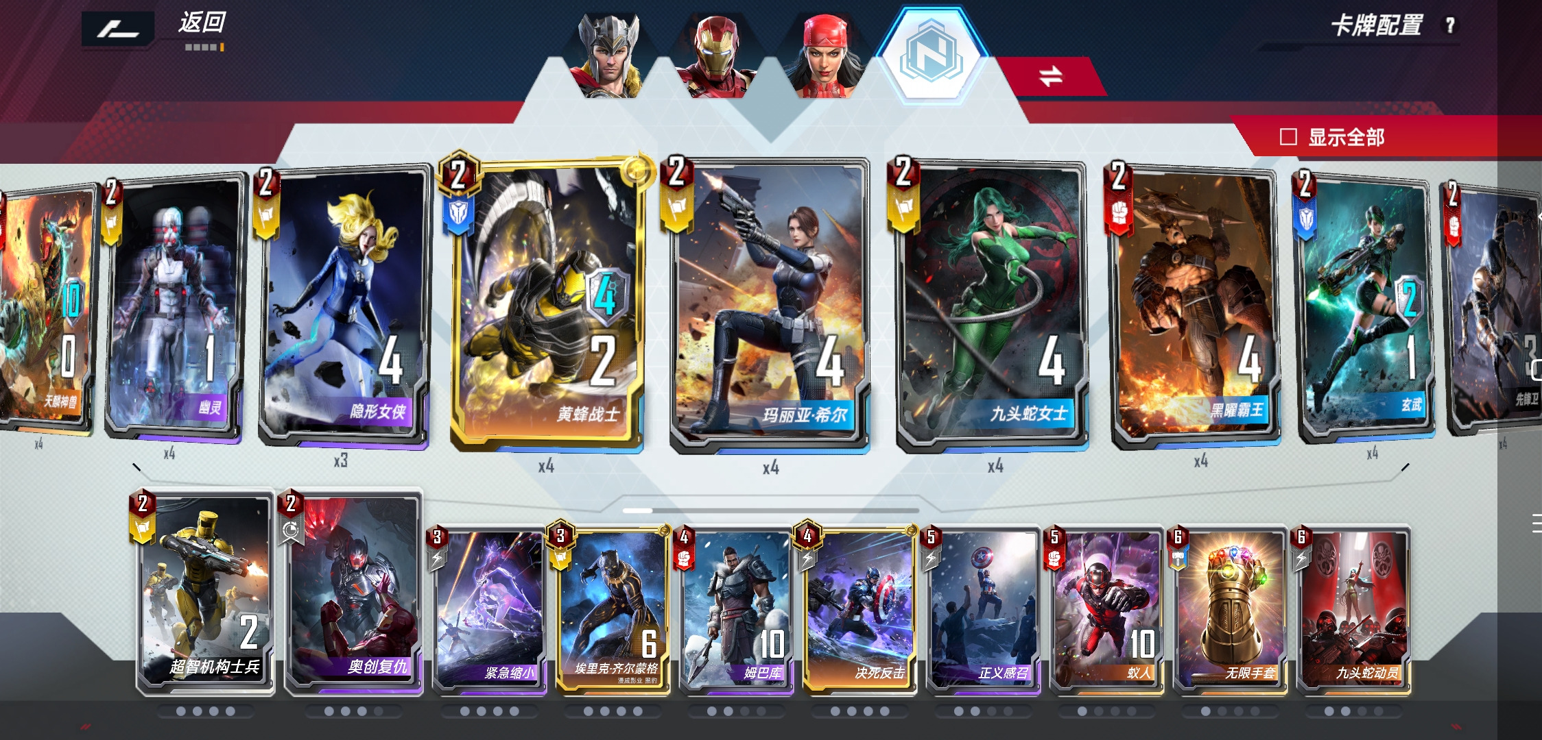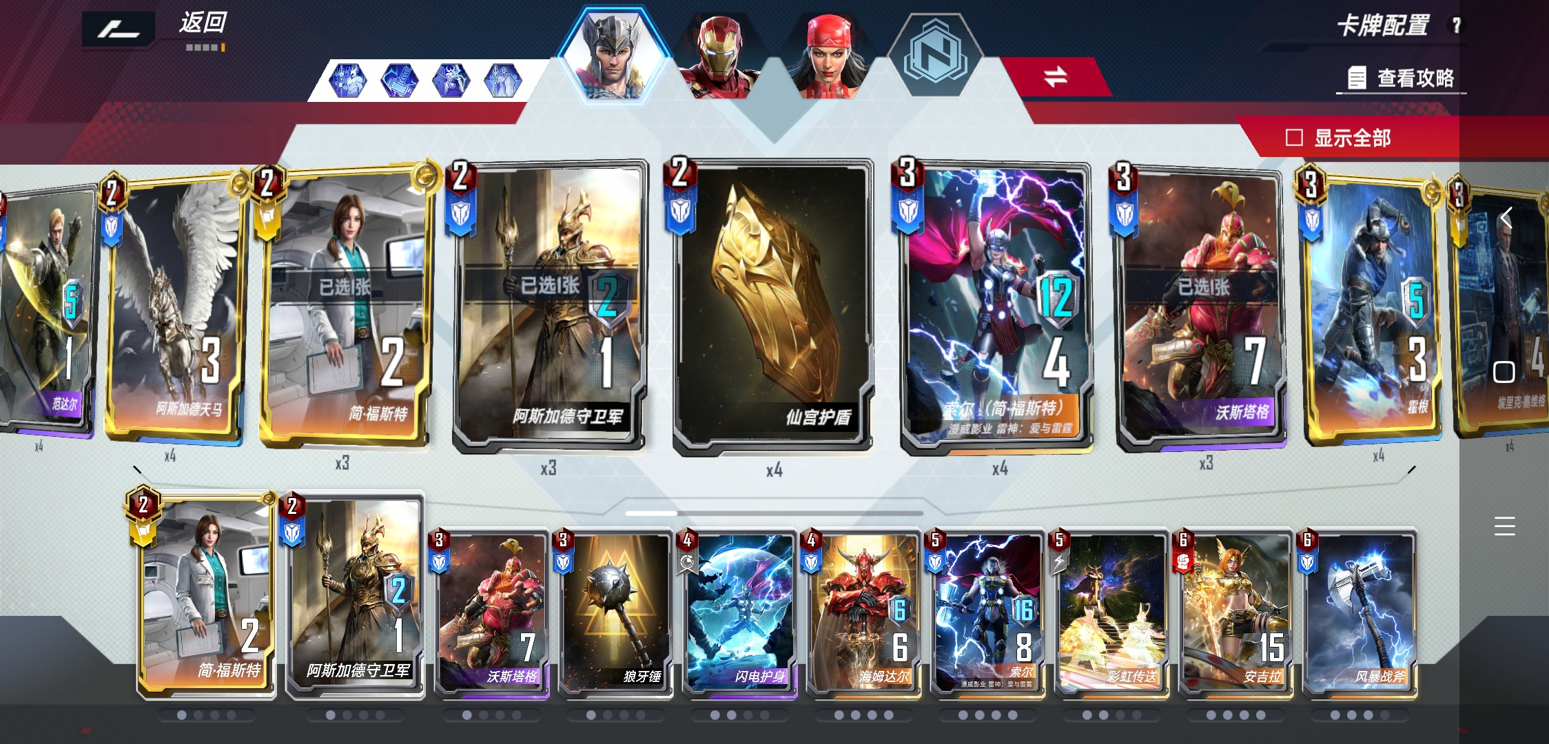 说完缺点我们来说说队伍的选择,首先对于奥创四败,要契合四败,假面夫人是缺少不了的,所以角色上钢铁侠是不可缺少的一环,然后另一个角色必须非常契合四败,要不索尔,要不海拉,可是海拉在这系统下她原来的四败熬终幕独行其实已经足够了,而仙宫是因为有很多四败技能还有全游戏唯一一个的角色里的卡能在四败获取收益‘彩虹传送’,最后我想带一个过度的角色,在这上面我想大多数人都会想到是寡妇或艾丽卡,但寡妇除了春寡和阻击的作用没其他用途,艾丽卡,一来有5费锁血卡刀锋,二来有压血带来极大收益的7的意志,还有双刃和警棍等非常契合的武器,所以非她莫属,至此组建完毕。