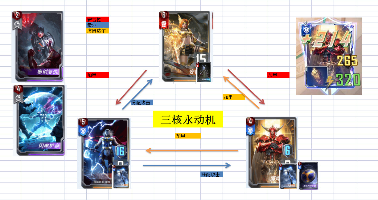 可能会有人说什么三核永动机,不就是奥创四败加了新索尔而已,以前的四败奥创不也是怎么玩,大惊小怪,俗话说,四败奥创带条狗都强,话这样说也不是没错,不过我带的是新索尔,那可不是一点点强,他的雷神之力可以平均分配给所有的仙宫,而安吉拉又是一马当先可以为队伍提供大量护甲,最后海姆达尔集众仙宫之力,顶住敌人的强大攻势,再赋予我方彩虹之力,此套循环为三核永动系统。