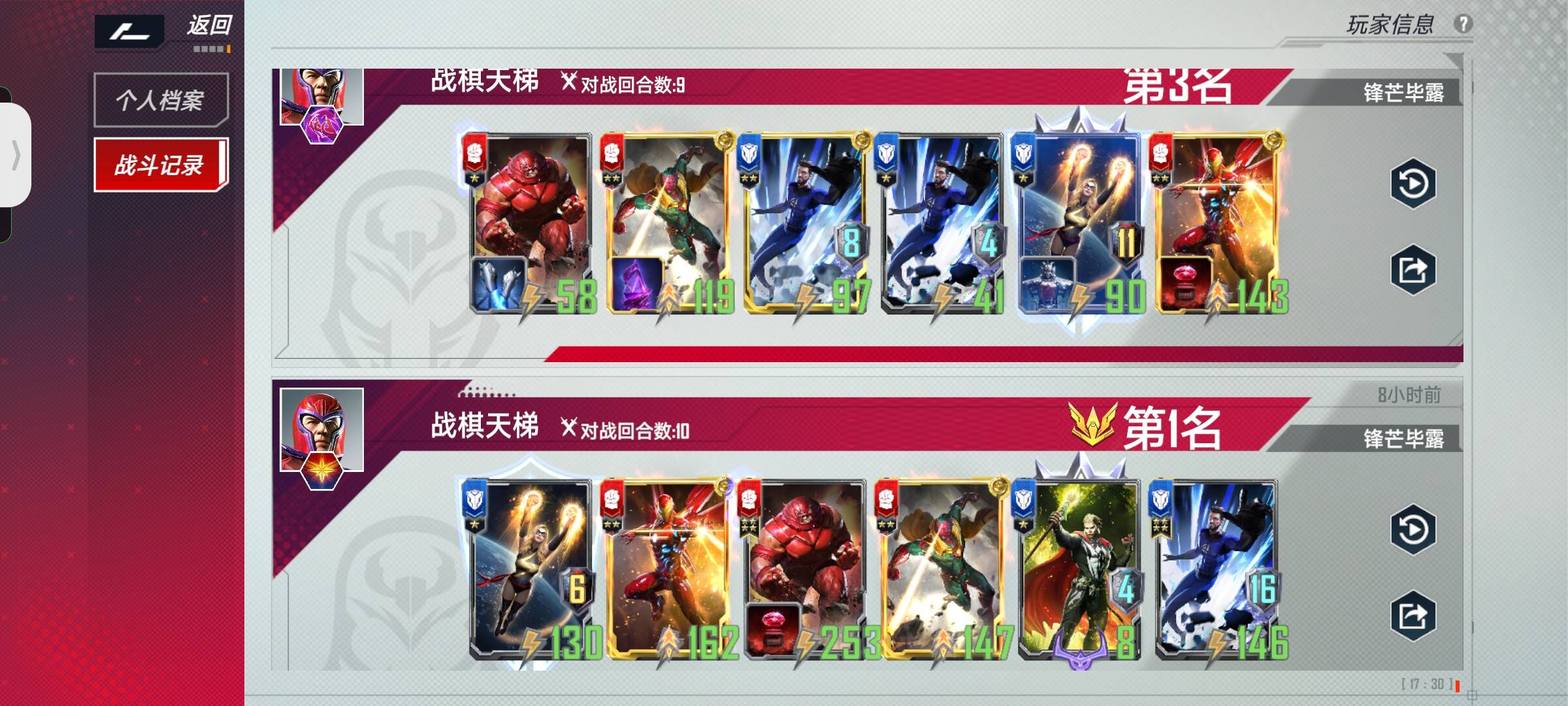 6,九回合以后:继续找齐4星万能,找爱国者并不断打出牌,刷战力。买能量操纵事件,看情况使用。很少上6本,除非要找凤皇或手套。最后阵容看情况,一般就是幻视/姆巴库/凤皇3选1。