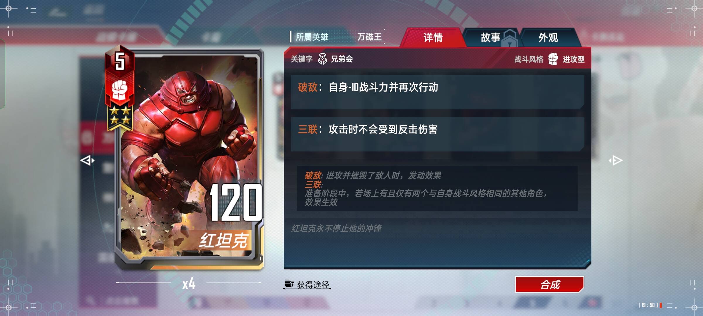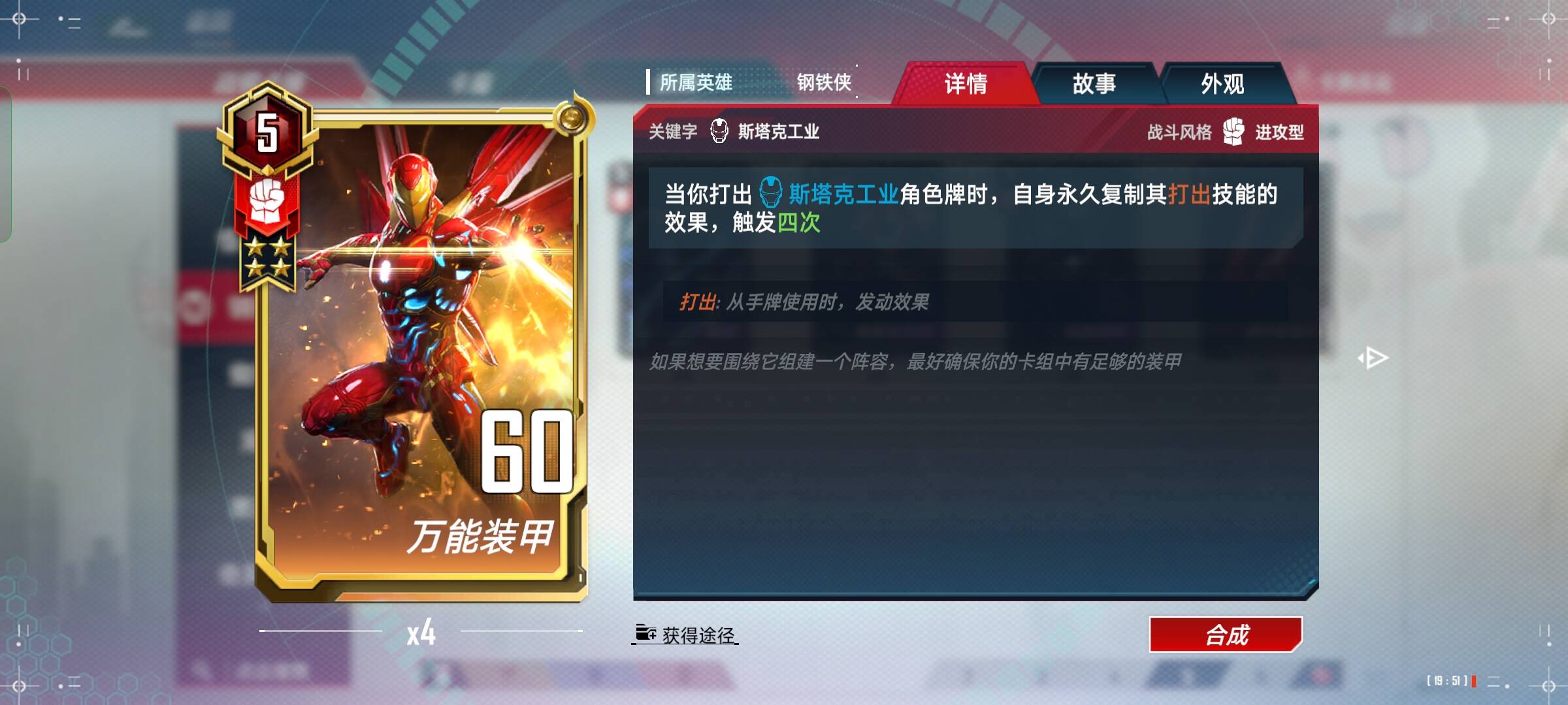 究极钢铁侠×4,一般在在万能2星时开始用,能合则合,不能合时可以先放手牌不打出,如果需要加战力,则打出后卖掉不要犹豫。