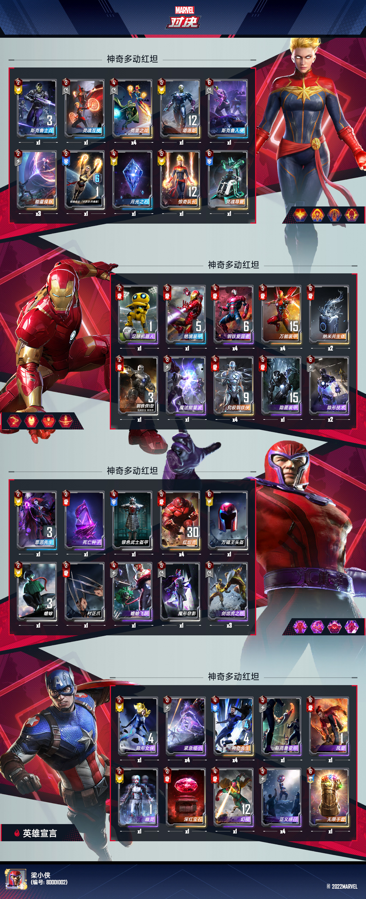 各位老哥你们好!我是梁小侠。 S12赛季迎来新套牌神奇四侠,让天梯环境出现了变化,神奇先生的技能强度很好,天梯出现了各类搭配万能和爱国者的卡组,让红队快攻更有战斗力。本文介绍的是围绕神奇先生和万能,养成红**并达成三联,并搭配惊队的2费事件增加行动次数,发挥红**多动清场的效果,经过测试,卡组强度还是挺不错的。备注:卡组非本人首创,我也是在天梯看到有大佬玩,慢慢琢磨过来的,也打了很多把测试过强度,才在此分享。