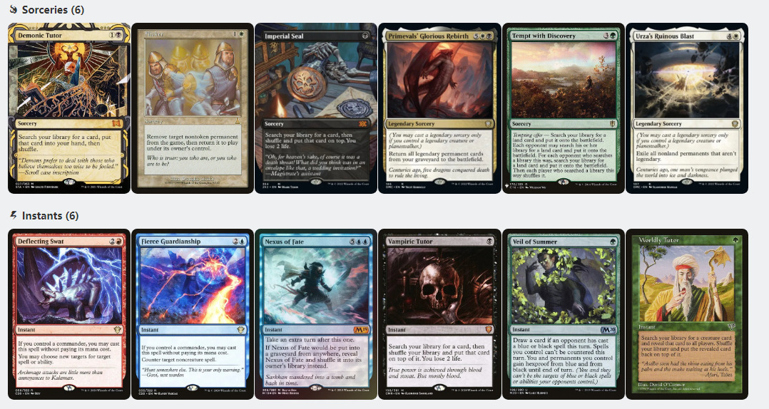 法术瞬间的选择上比较简单,康和保护少,因为是偏娱乐向的套牌。Flicker是迪哈达组合技的组件之一。龙命可以避免被磨牌磨死也可作为小泰幼兽组合技抓起牌库后启动无限回合。太古诸龙的辉煌重生可触发裘达异能并将所有传奇永久物掘回场,配合母圣树不可被反击,配合迪哈达组合技可以将套牌内所有传奇放进场。探索诱惑主要是因为本地身份局的存在加入的ramp(身份测试)单卡可替换为各种加速单卡或神器。