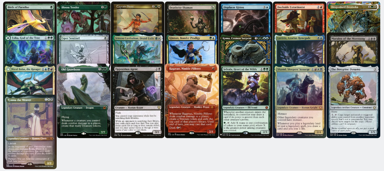 大家好,这里是一个普普通通的万智萌新。从入坑EDH时的黑绿松鼠将军聒牙、猫猫风华到后来为了不被官禁多人和身份局各种大佬毒打组的各种cEDH套牌,一直有一个想法就是想组一套能有一堆旅法助战的酷炫套牌。尝试过五色裂片妖,结算食物链无限费成功,对手直接投牌认输与旅法毫无关系,pass;尝试过五色世界树神翻翻乐,主将吃满点杀、康和扫场,坐大牢,pass;尝试过独眼嘉斯,这牢坐的还不如世界树神,pass。