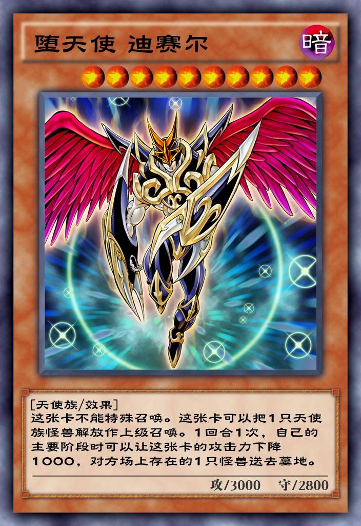 这张卡不能特殊召唤。这张卡可以把1只天使族怪兽解放作上级召唤。1回合1次,自己的主要阶段时可以把这张卡的攻击力下降1000,对方场上存在的1只怪兽送去墓地。由于堕天使大多是特召,所以这张卡在决斗链接有投入价值.本身有3000打点,降1000攻可以让对方场上1怪送墓进行抢血otk,推荐抽2张.